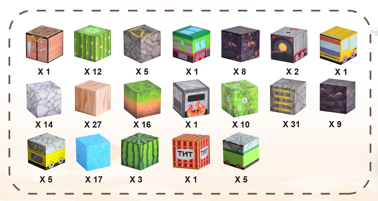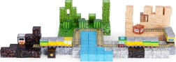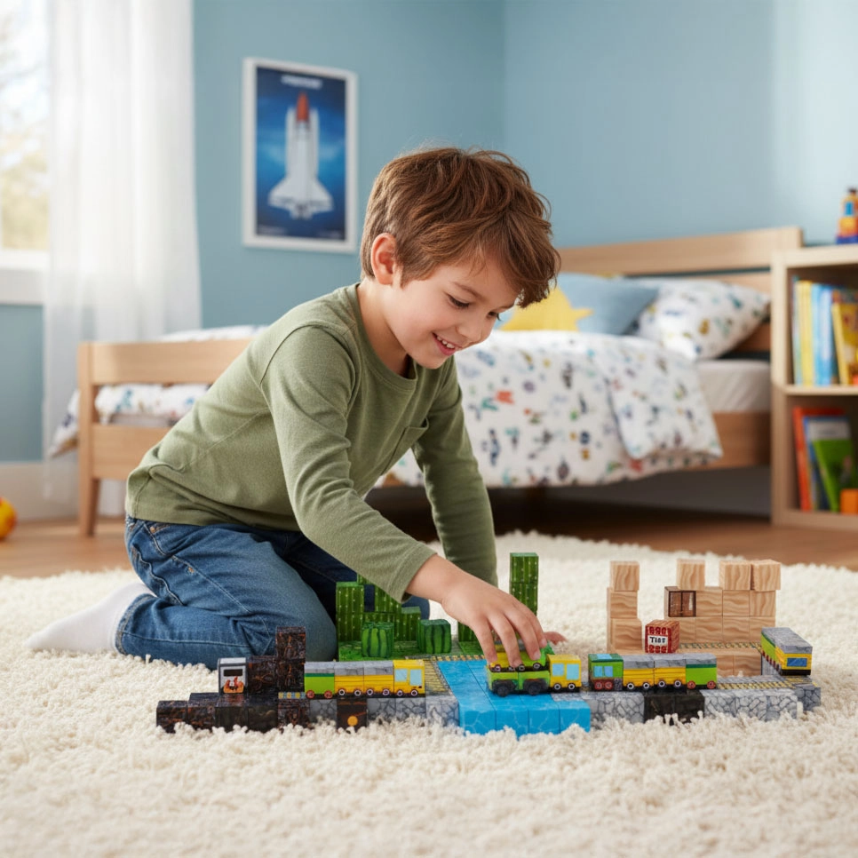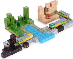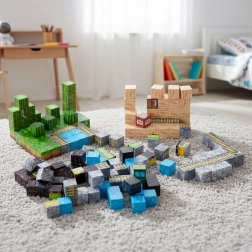 Цветните блокчета с щампи на трева, вода, дърво и камък позволяват да се строят пейзажи, мостове и трасета за безкрайна игра.