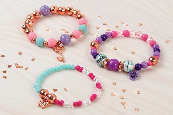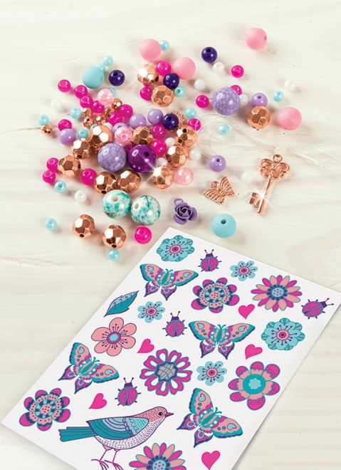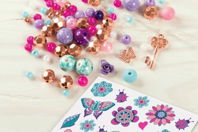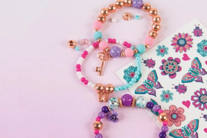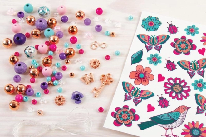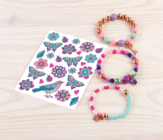 Развий креативността си и създай собствени цветни гривни, които да съчетаеш с временни татуировки. Благодарение на пъстрите мъниста, висулките и лесното нанизване, само за миг ще се получат бижута, които ще зарадват всяка малка кокетка.
