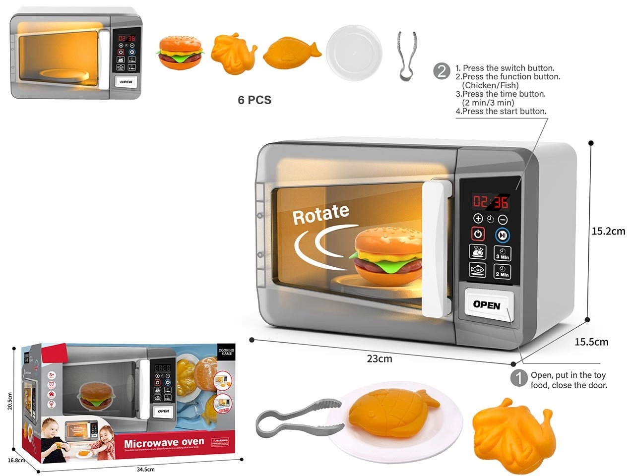Реалистичната детска микровълнова фурна е чудесна за малки готвачи, които обичат да имитират възрастните. Предлага осветен вътрешен отсек, въртяща се чиния и контролен панел с бутони, така че изглежда като истинска микровълнова, но е напълно безопасна за деца от 3 години.