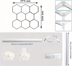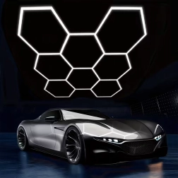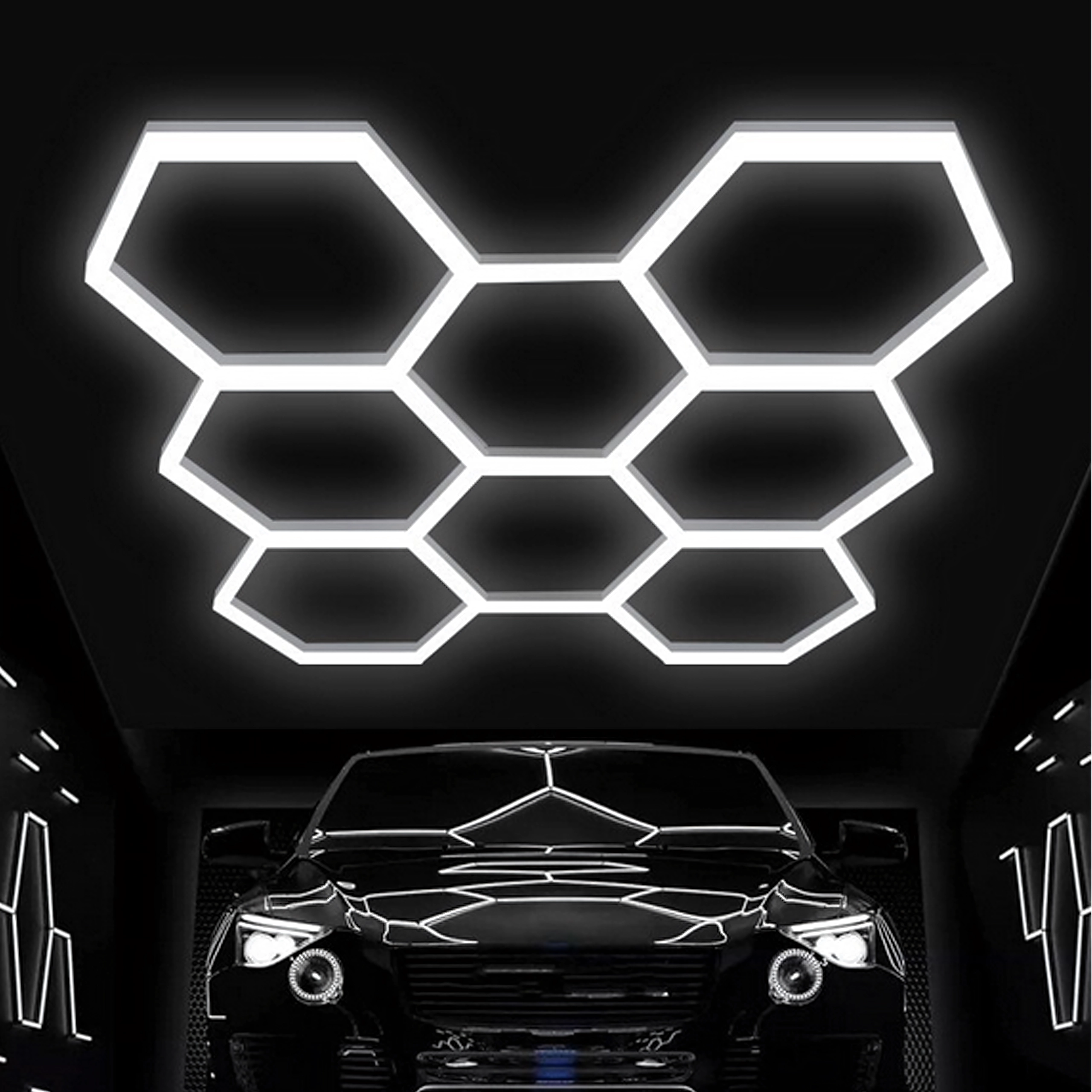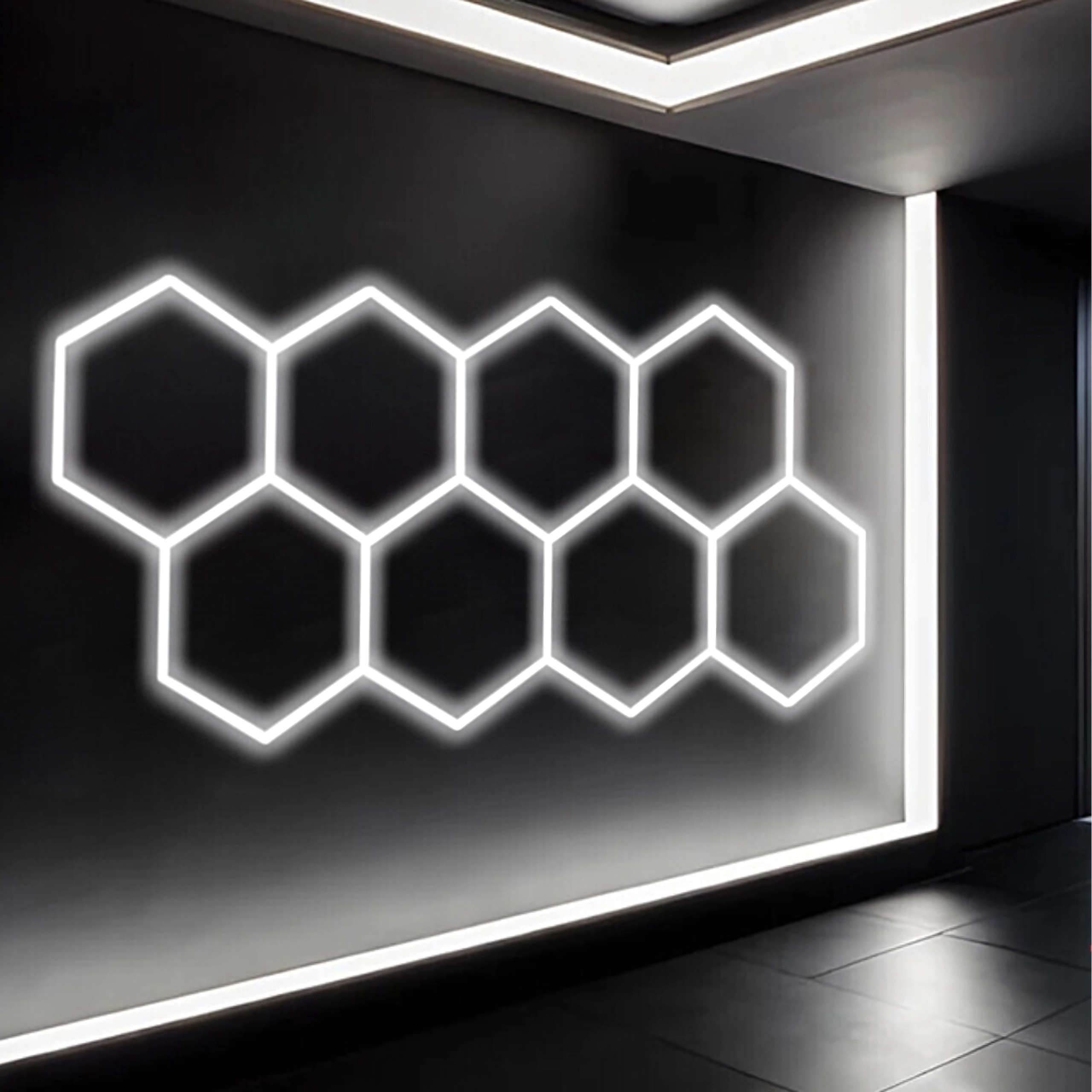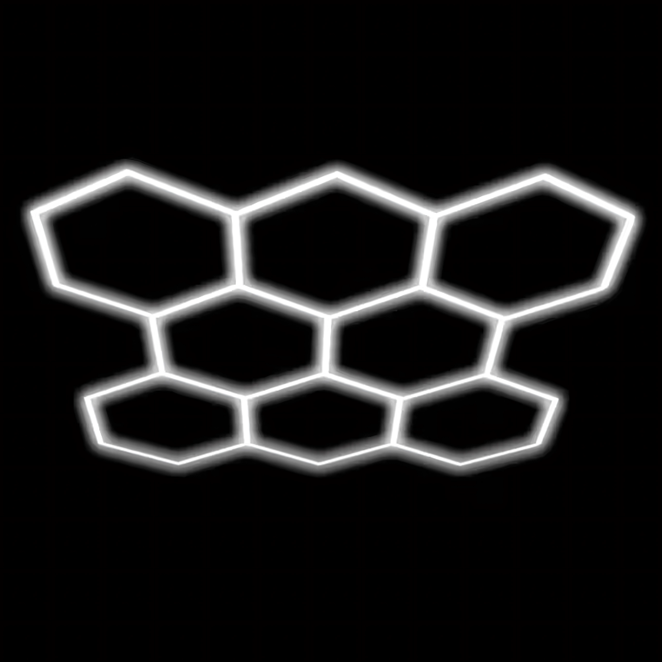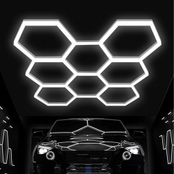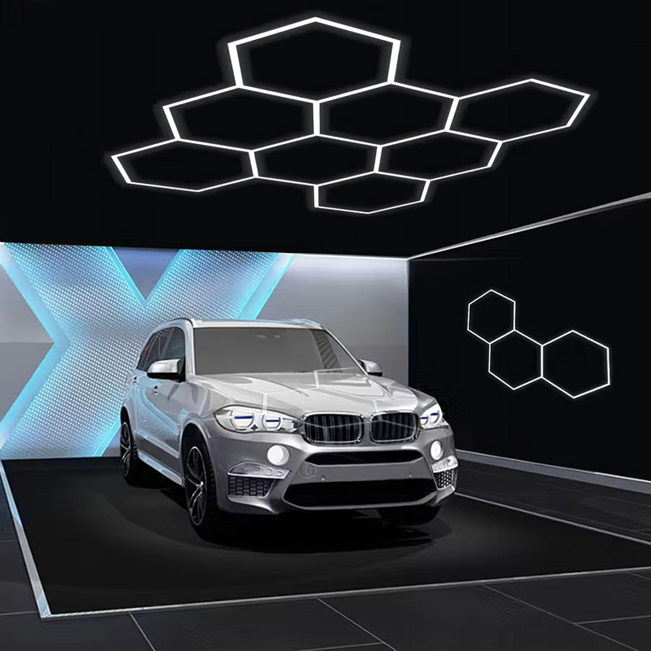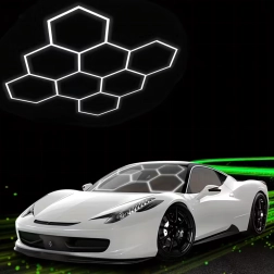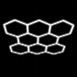 Хексагоналният LED панел се състои от модулна конструкция, която създава впечатляващ модел, вдъхновен от пчелна пита. Благодарение на високата мощност от 280 W и студената цветова температура 6500K предлага изразителна, чиста и равномерна светлина за работа и презентация на превозни средства, продукти или интериори. Идеален избор за гаражи, детайлинг боксове, шоуруми, офиси и модерни домакинства.
