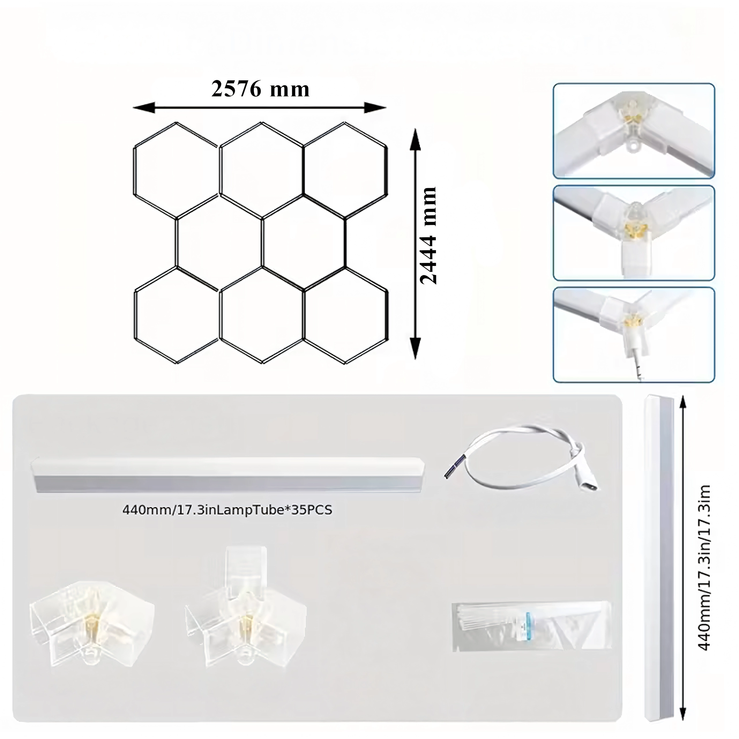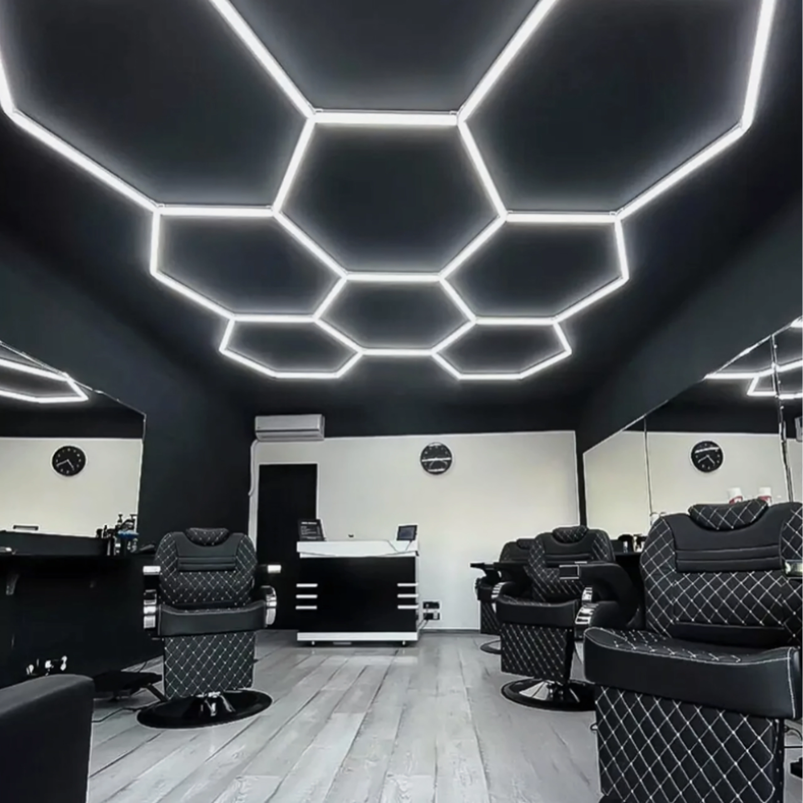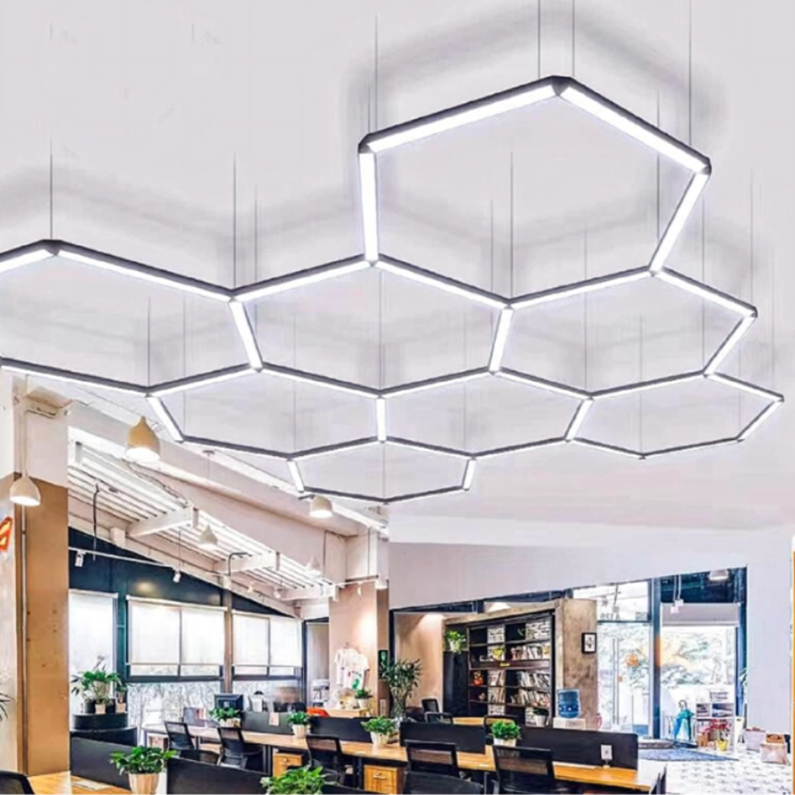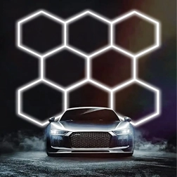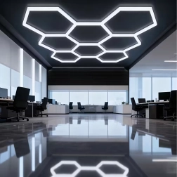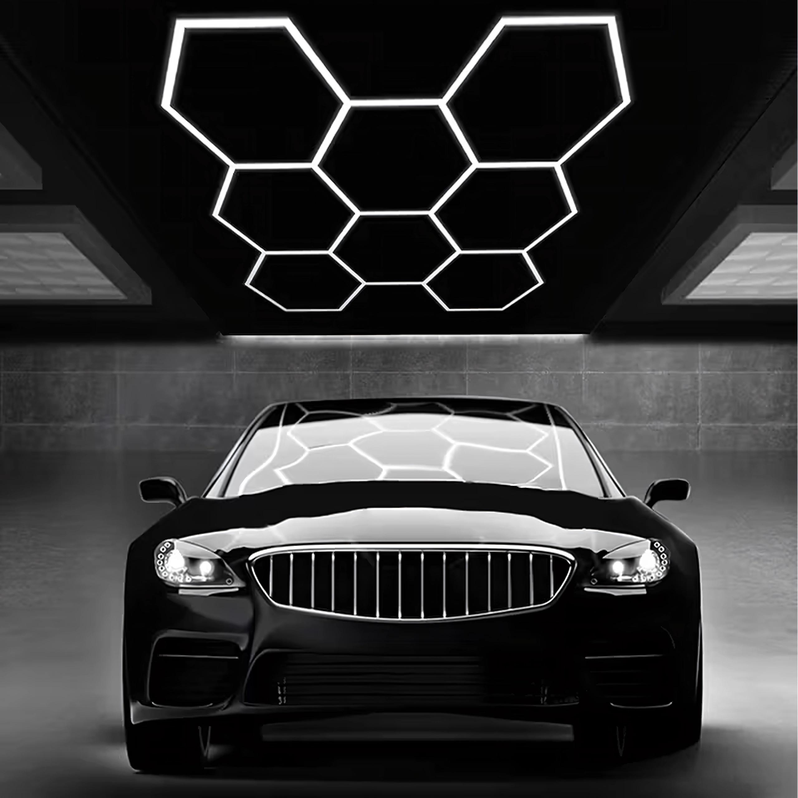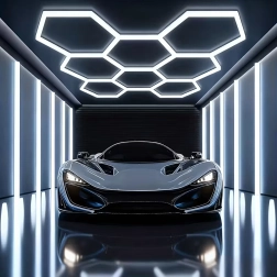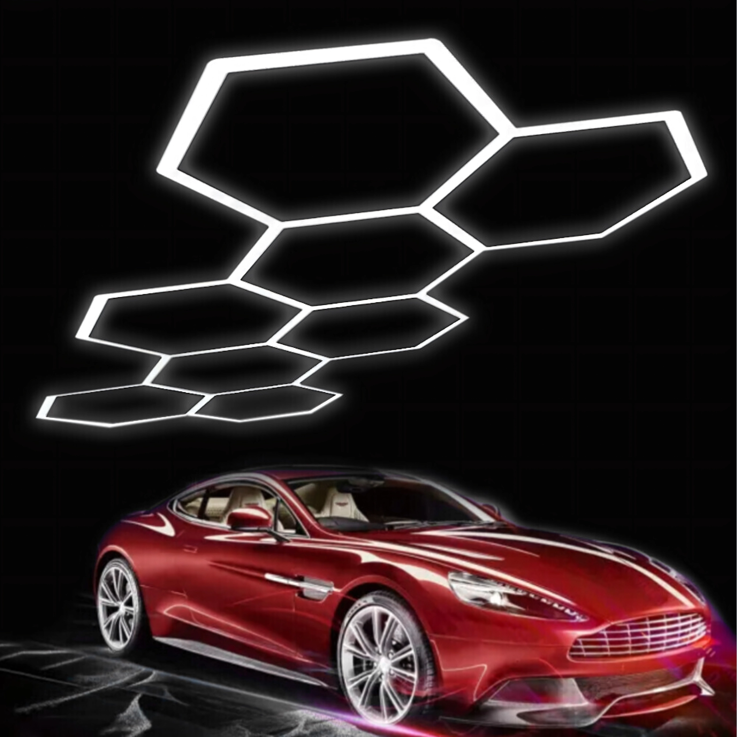 Хексагоналният LED панел се състои от модулна конструкция, която създава впечатляващ модел, вдъхновен от пчелна пита. Благодарение на високата мощност от 280 W и студената цветова температура 6500K предлага изразителна, чиста и равномерна светлина за работа и презентация на превозни средства, продукти или интериори. Идеален избор за гаражи, детайлинг боксове, шоуруми, офиси и модерни домакинства.