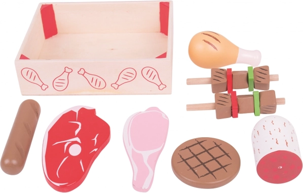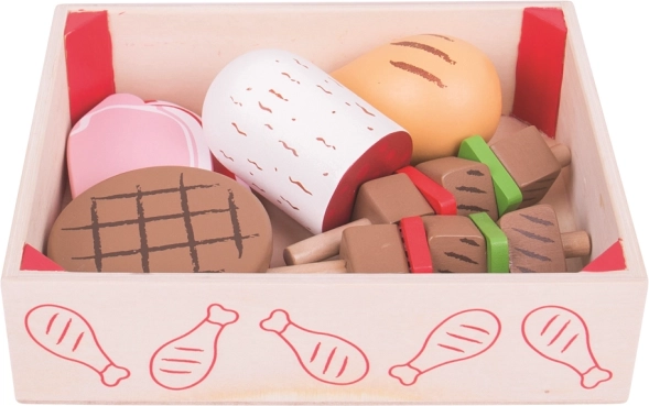 Този качествен дървен сандък е пълен с „месни“ специалитети, познати на децата от кухнята. В него ще открият бекон, стек, наденица, пиле и други части, с които лесно ще приготвят угощение за цялото семейство. След играта всичко се прибира обратно в практичната кутия – редът е за миг.