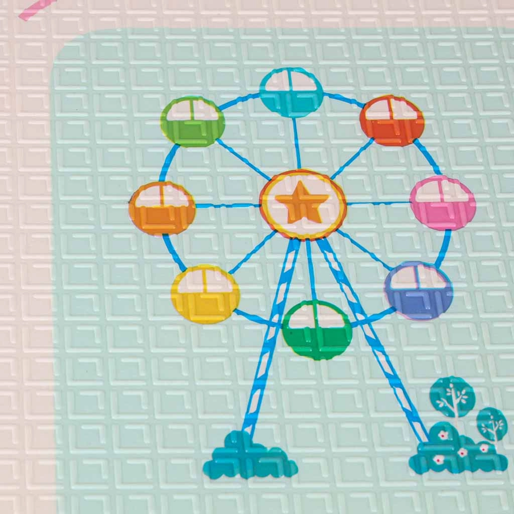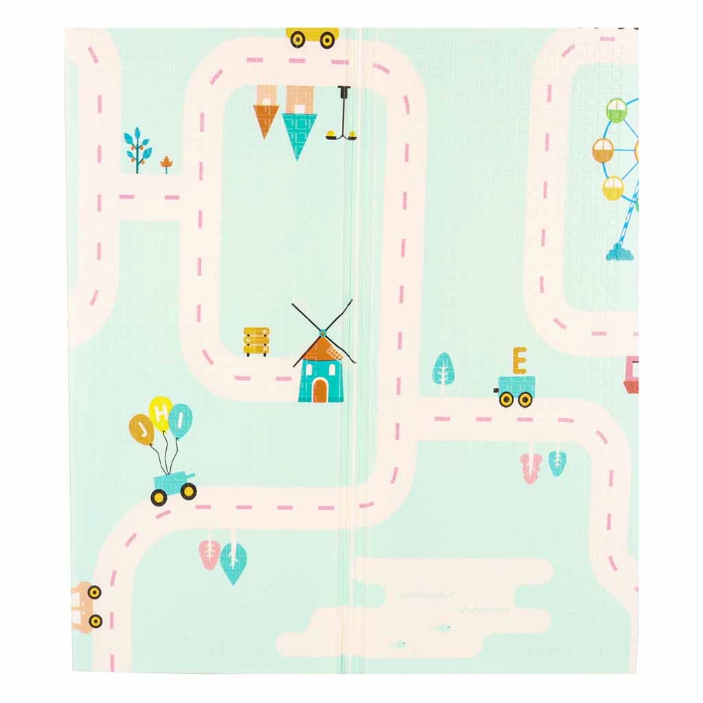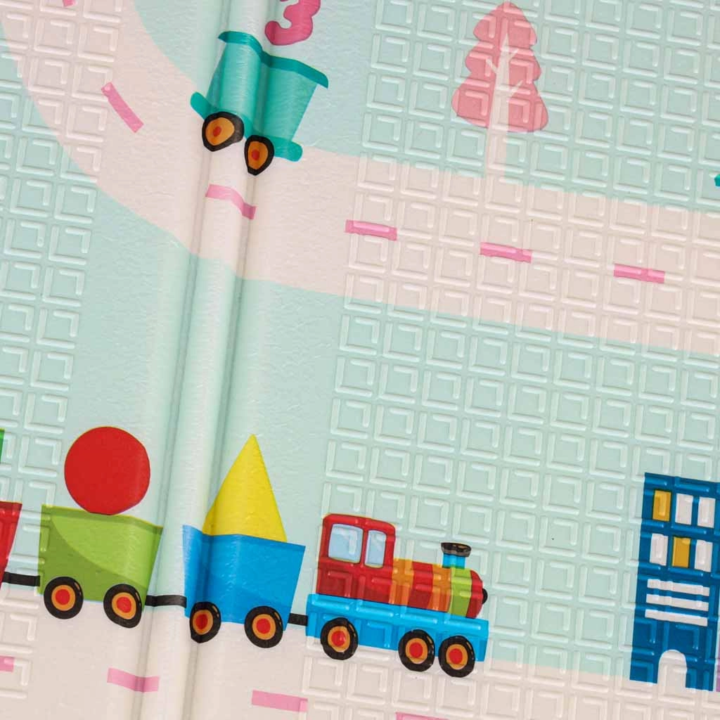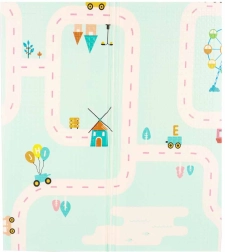 Двустранната пяна постелка с размери 180 × 200 × 1 см създава безопасно и удобно пространство за игра, първи обръщания и пълзене. Плътната XPE пяна омекотява ударите, предпазва от студ от пода, а противохлъзгащата текстура осигурява стабилност при движение. Едната страна с очарователни панди и другата с пътен мотив подпомагат фантазията и ученето.
