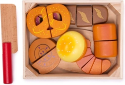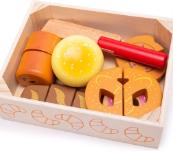 Всеки елемент от печивата е свързан с велкро и може да бъде „нарязан“ с дървения нож за по-реалистична игра.