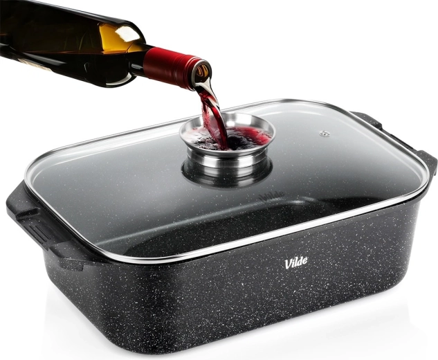 Благодарение на дозатора за течности в капака можете по време на печене да допълвате бульон, вино или марината без излишни топлинни загуби. Интегрираните дръжки улесняват пренасянето, а издръжливото дъно е подходящо за фурна и всички видове котлони, включително индукция. Тавата е устойчива до 250 °C (със стъклен капак до 220 °C).