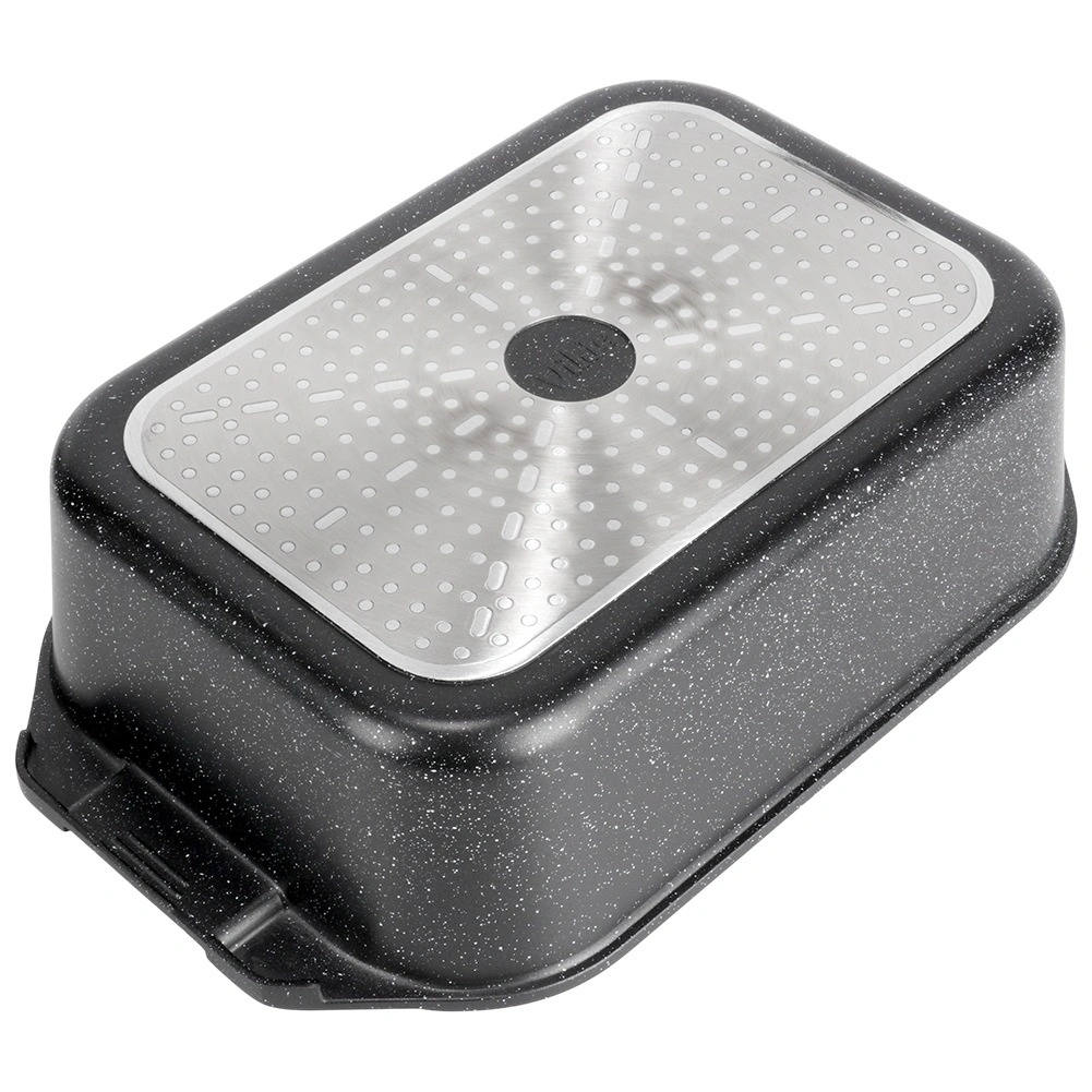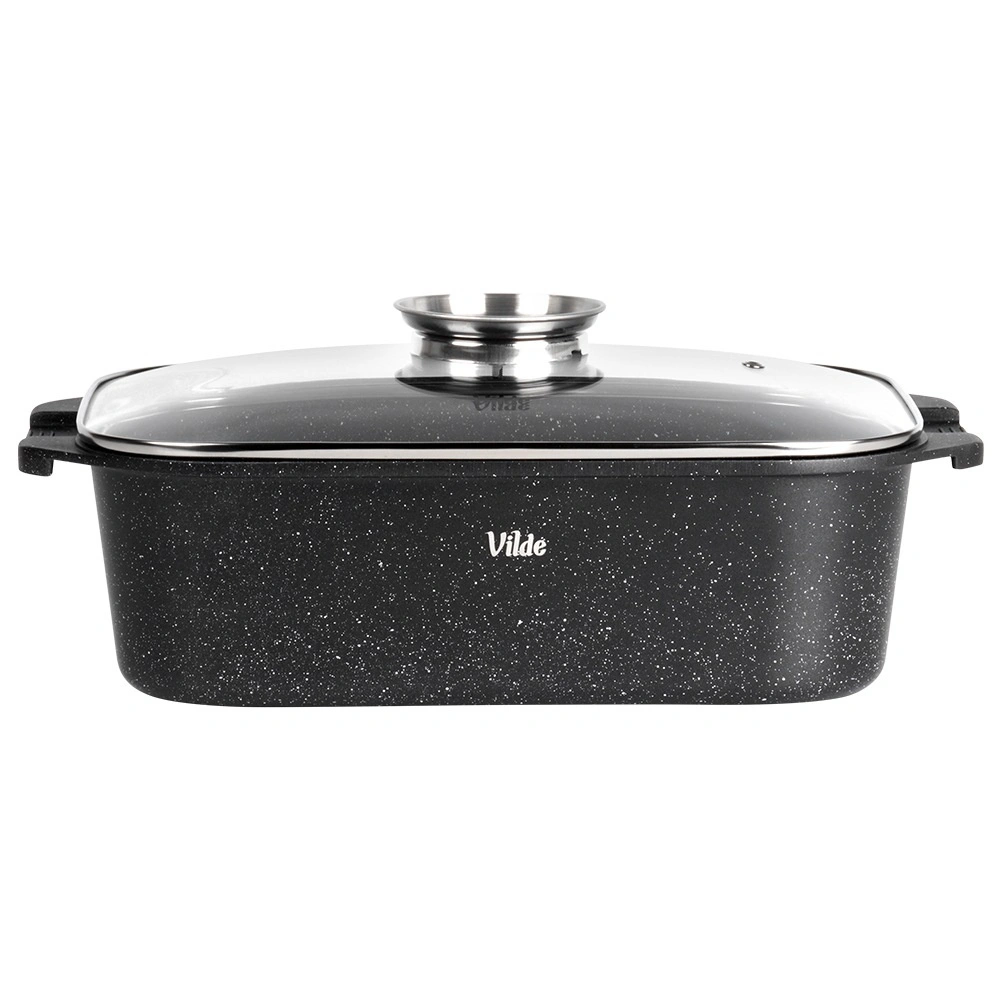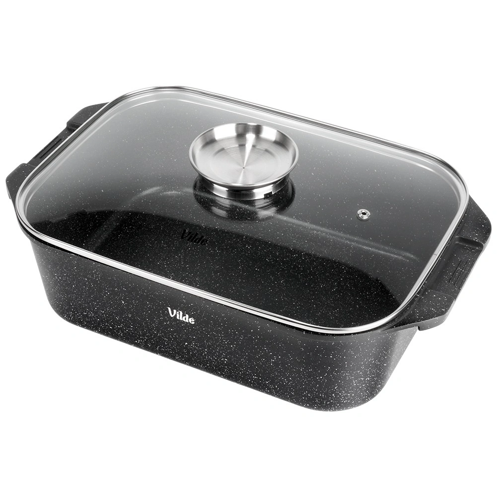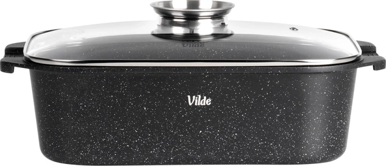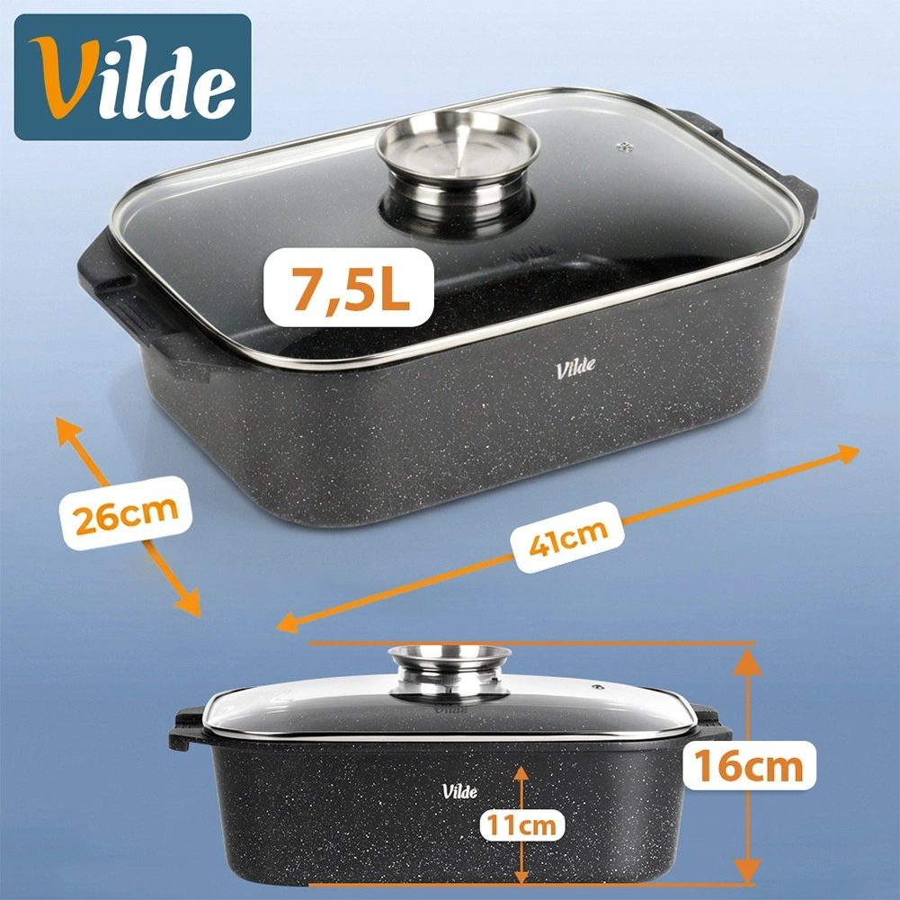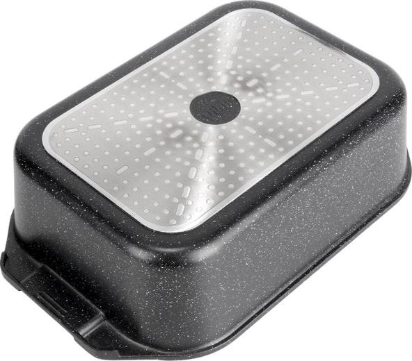 Универсалната тава с размери 41 × 26 × 16 см (височина на съда без капак 11 см) е надежден помощник за ежедневното готвене. Здравият алуминиев отливък с нелепнещ гранитен слой осигурява равномерно разпределение на топлината и лесно отделяне на ястията. Стъкленият капак е термоустойчив и позволява удобен контрол по време на приготвяне.