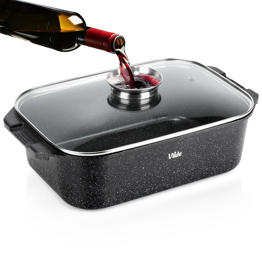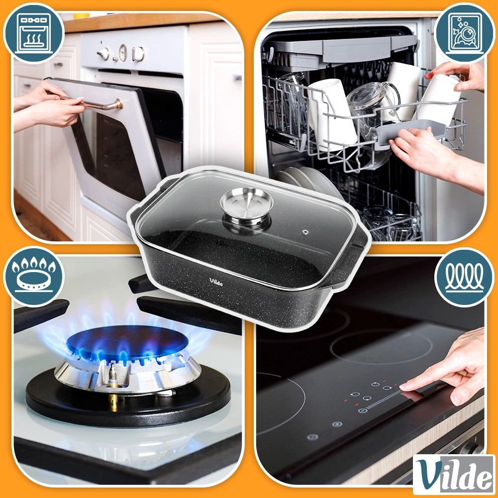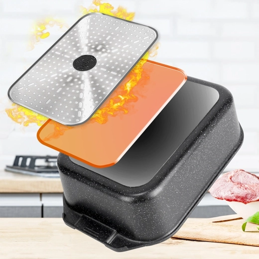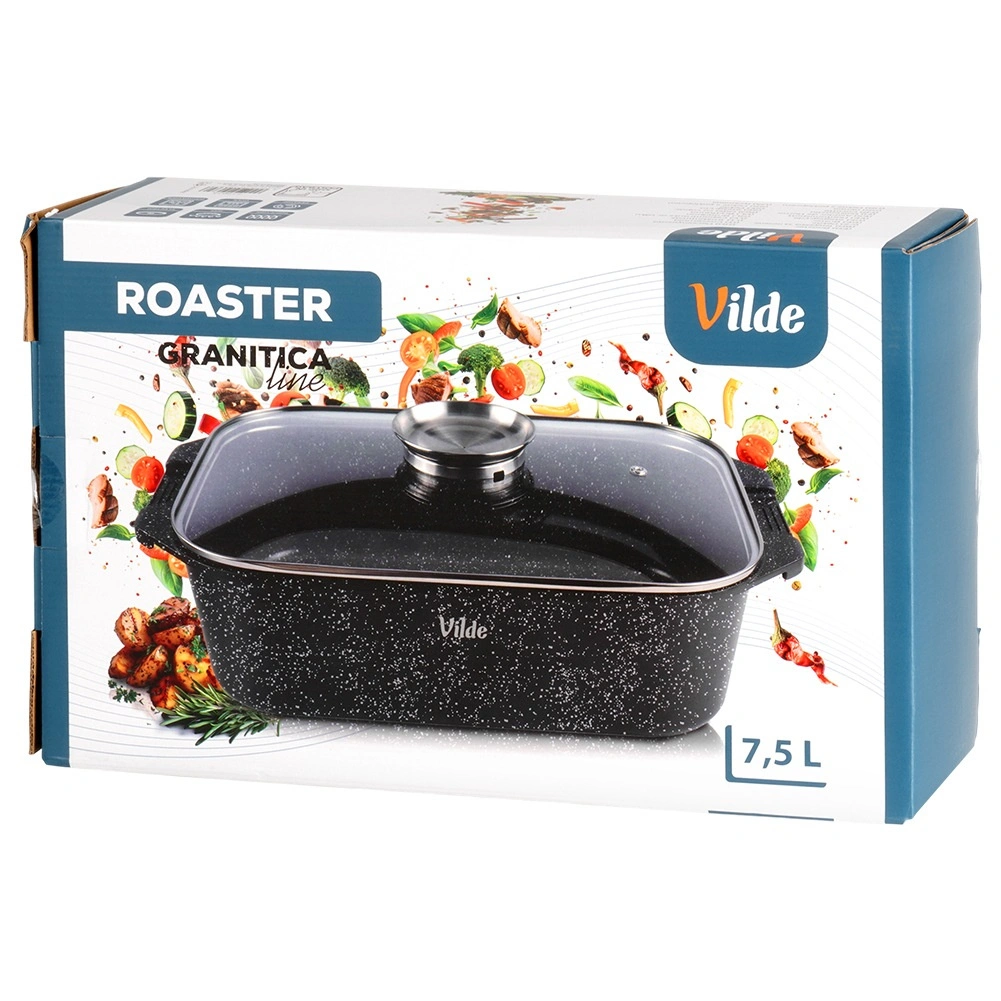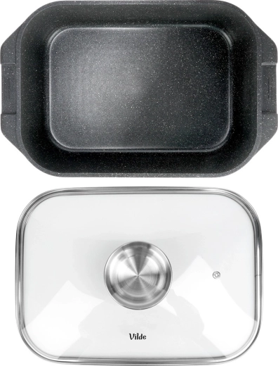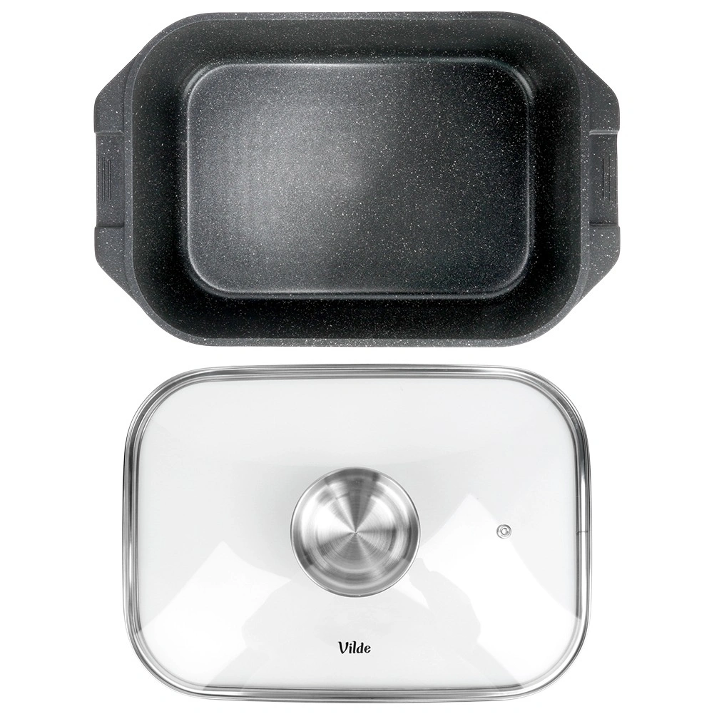 Универсалната тава с размери 41 × 26 × 16 см (височина на съда без капак 11 см) е надежден помощник за ежедневното готвене. Здравият алуминиев отливък с нелепнещ гранитен слой осигурява равномерно разпределение на топлината и лесно отделяне на ястията. Стъкленият капак е термоустойчив и позволява удобен контрол по време на приготвяне.