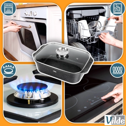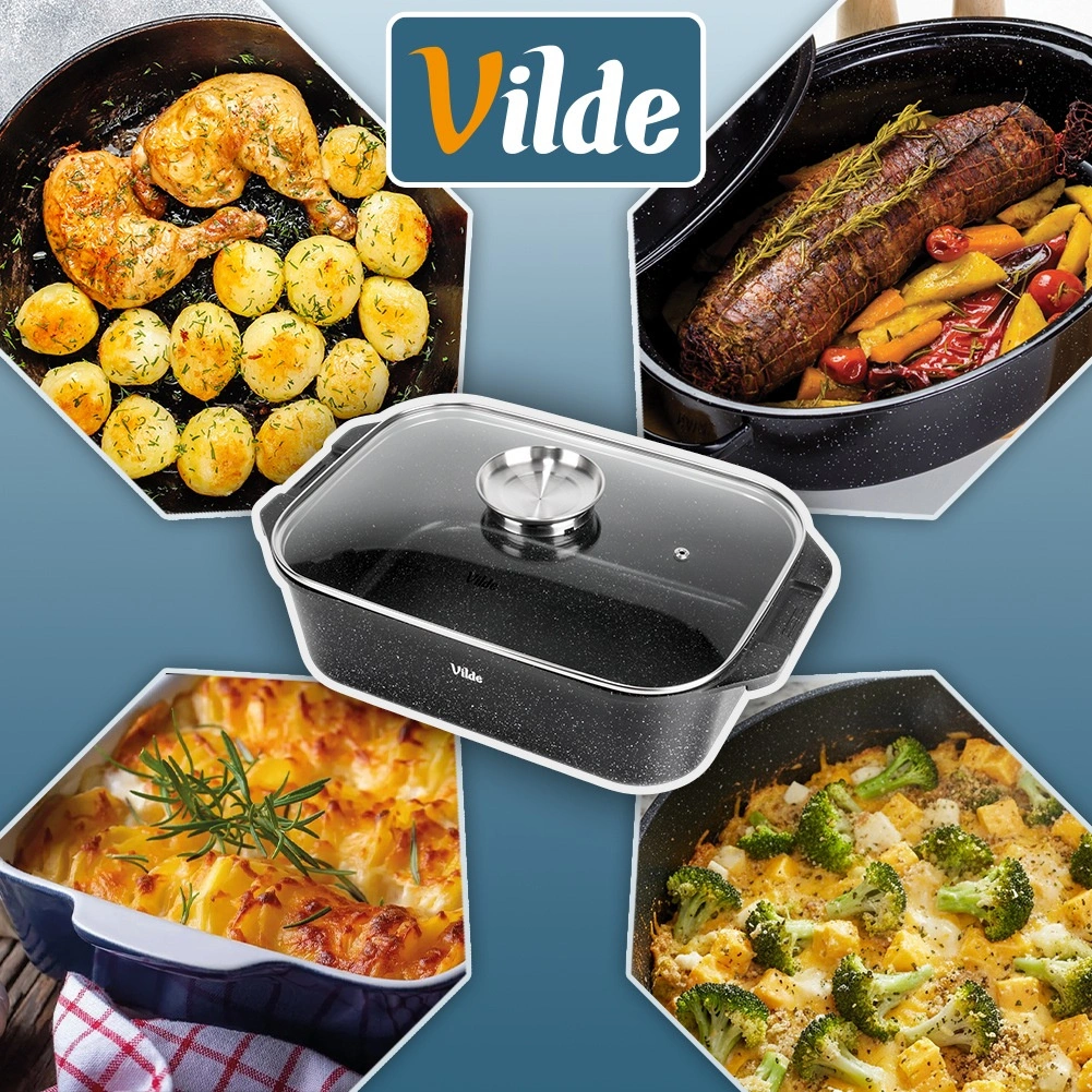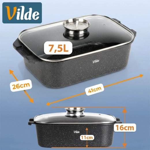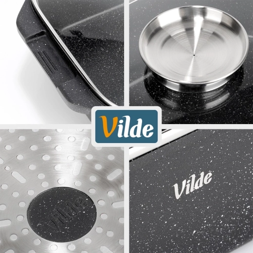 Лесна поддръжка и дълъг живот: качественото покритие намалява загарянето и целият комплект може да се мие в съдомиялна машина. Оригинален продукт на марката VILDE от линията GRANITICA LINE, произведен по европейски стандарти.