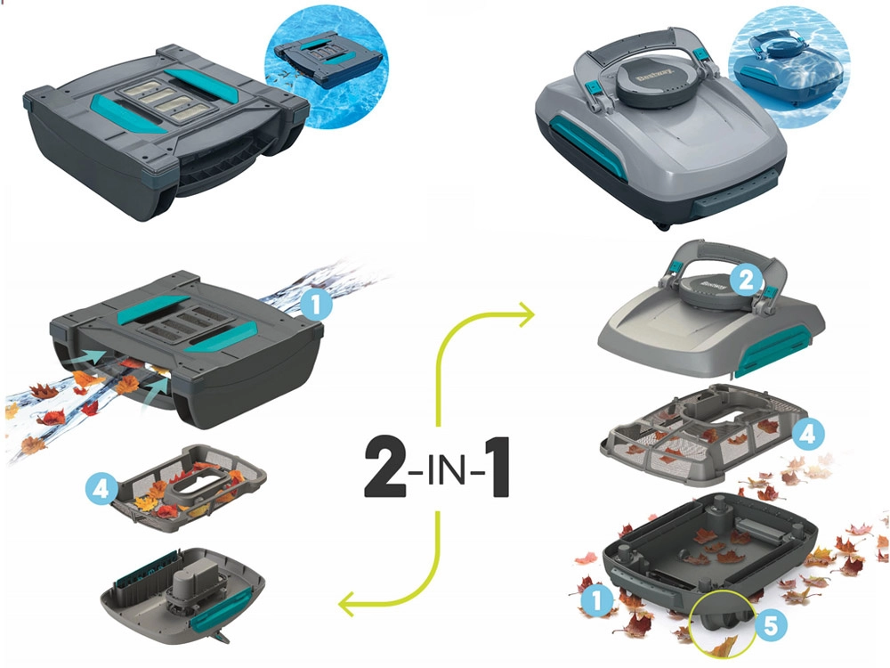 Двата лесно сменяеми модула позволяват прахосмукиране на дъното и скимер за събиране на замърсяванията от повърхността. Поддържайте басейна напълно чист без допълнителни устройства.