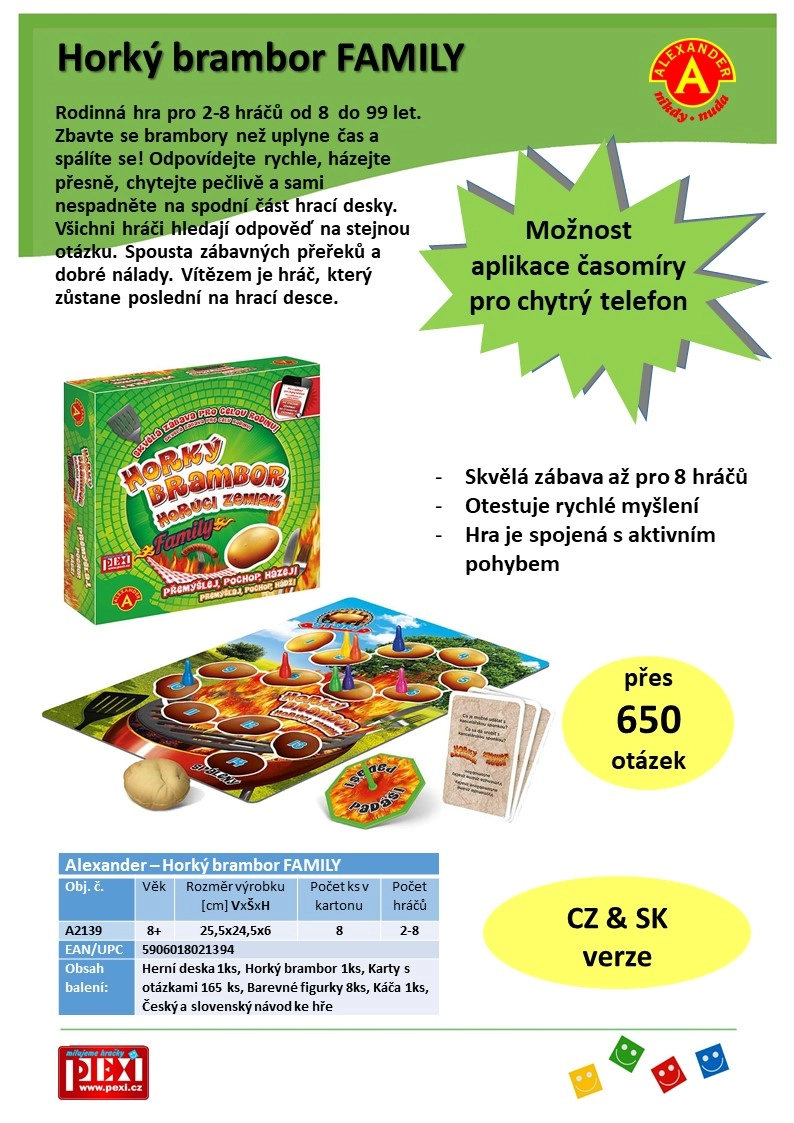 Съдържание на комплекта: игрална дъска, 165 карти с въпроси, 8 цветни фигурки, пумпал, инструкции на чешки и словашки.