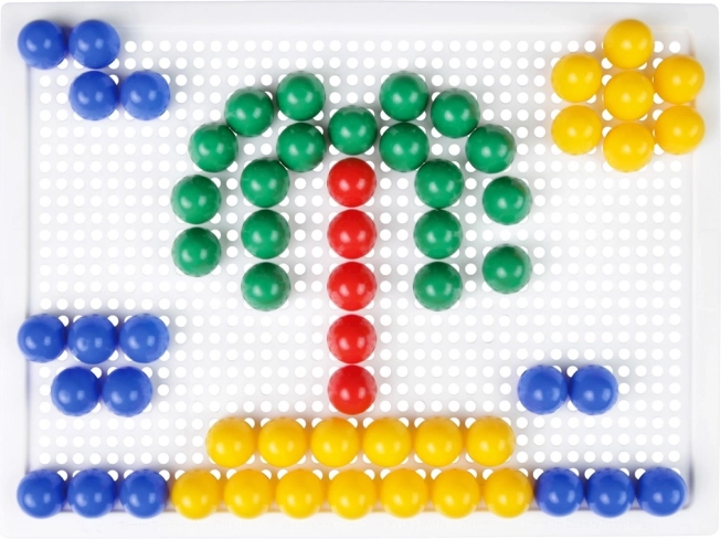 Комплектът съдържа пластмасова решетка 21 × 16 cm и 80 щифта с диаметър 15 mm. Благодарение на компактните размери е идеален за вкъщи и за път. Мозайката не включва шаблони – така насърчава свободната игра и фантазията.