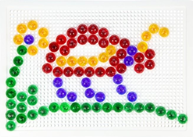Тази цветна кристална мозайка позволява на децата да създават оригинални мотиви – от животни до къщички и превозни средства. Прозрачните колчета сияят красиво и насърчават към още подреждане, докато стабилната решетъчна подложка държи всичко сигурно на място.