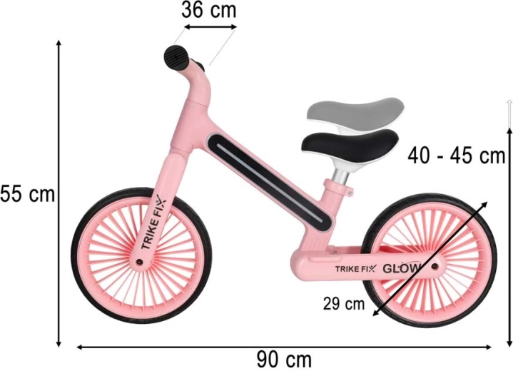 Баланс колелото TRIKE FIX GLOW LED е идеалният първи велосипед за малки колоездачи. LED осветлението в рамката добавя ефект „уау“ и по-висока видимост, докато противоплъзгащите грипове и стабилните EVA гуми дават увереност при всяко каране. Леката конструкция подпомага естественото учене на равновесие и плавния преход към колело с педали.