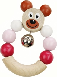 Очарователна дървена дрънкалка с мече в розов цвят ще зарадва всяко бебе. Вградената звънчалка звъни нежно, дрънкалката е много лека и благодарение на компактните размери 7 × 9 cm се държи отлично в малките ръчички. Продуктът отговаря на строгите изисквания на ЕС за безопасност на играчките и притежава сертификат Безопасни играчки.