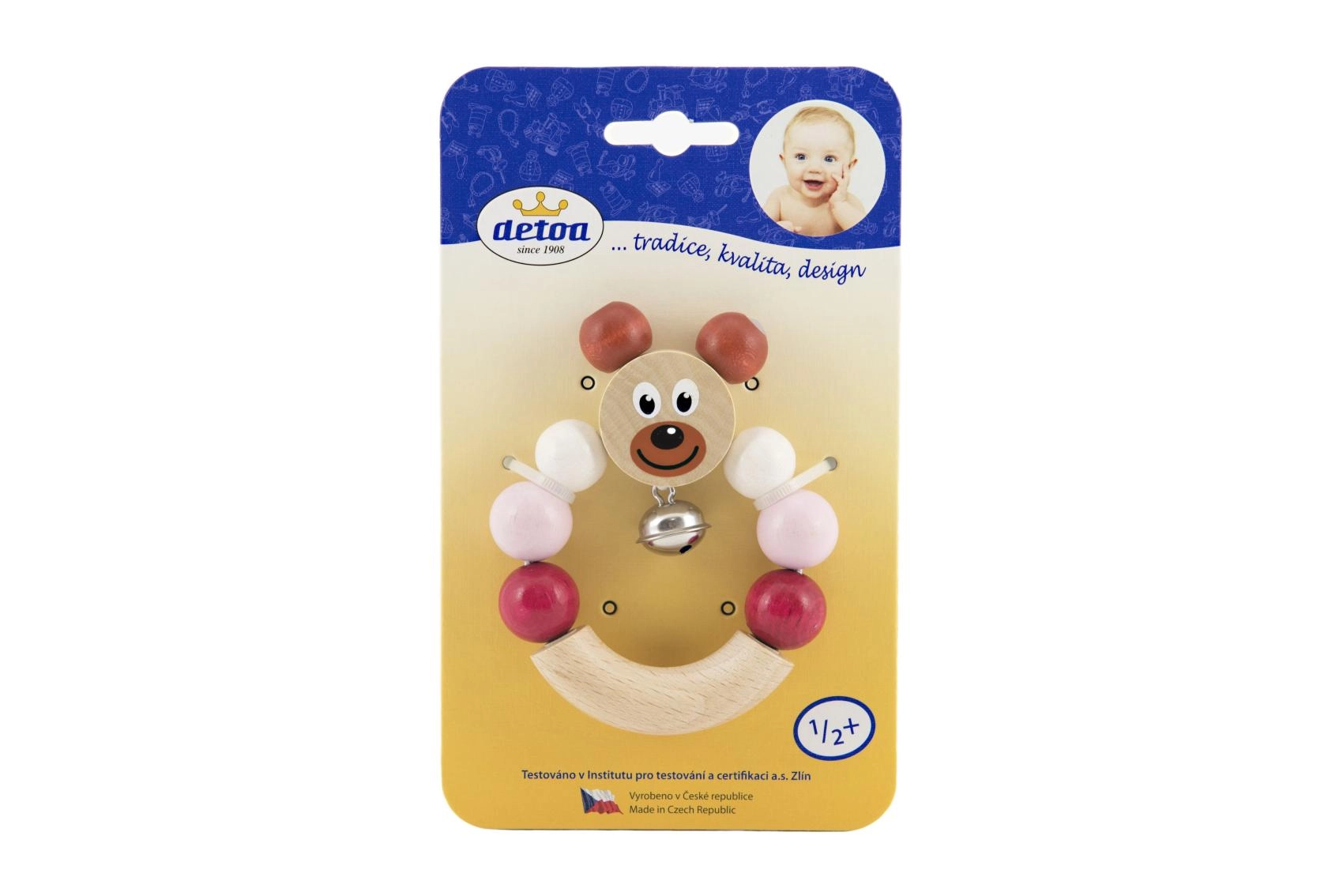 Detoa дрънкалка мече в розов цвят е идеалната първа играчка за развитие на слуха, осезанието и моториката. Нежният звук на звънчалката привлича вниманието на бебето, приятните материали и форма подпомагат безопасния и удобен захват.