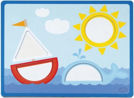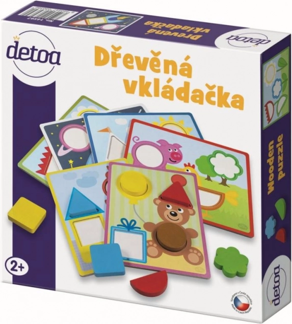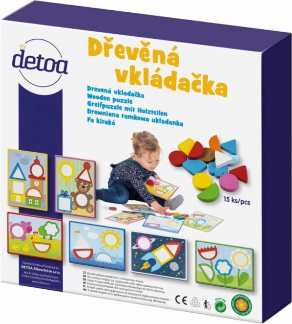 Открийте качествената дървена пъзел-вкладачка DETOA, която учи децата от 2 години да разпознават форми и цветове и едновременно развива тяхната фина моторика. В комплекта има 6 игрови шаблона и цветни дървени елементи, които се поставят в правилните отвори върху картинката. Играта е безопасна, издръжлива и отговаря на стандартите на ЕС за безопасност на играчките.