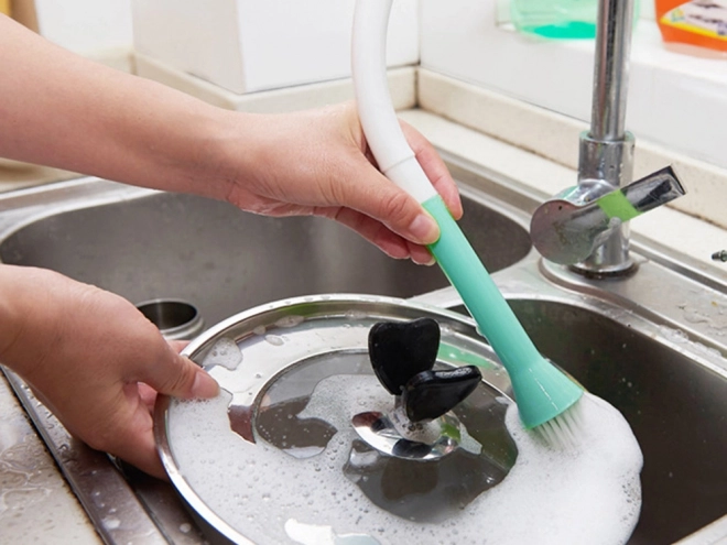 Гъвкавата четка за кухненски смесител превръща вашата чешма в практичен помощник за бързо и хигиенично измиване. Силиконовият накрайник осигурява сигурно закрепване, а извитата глава с влакна лесно премахва загорели участъци и засъхнали остатъци от храна.
