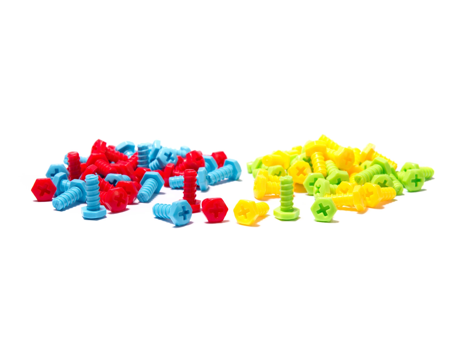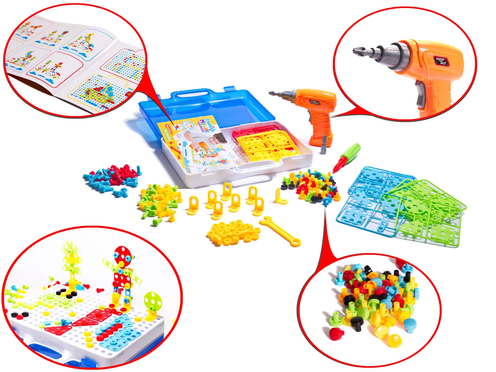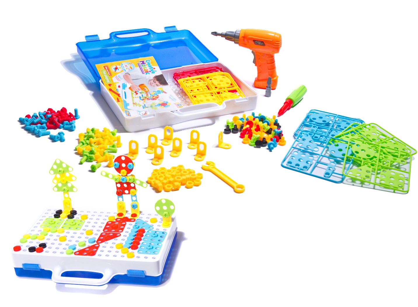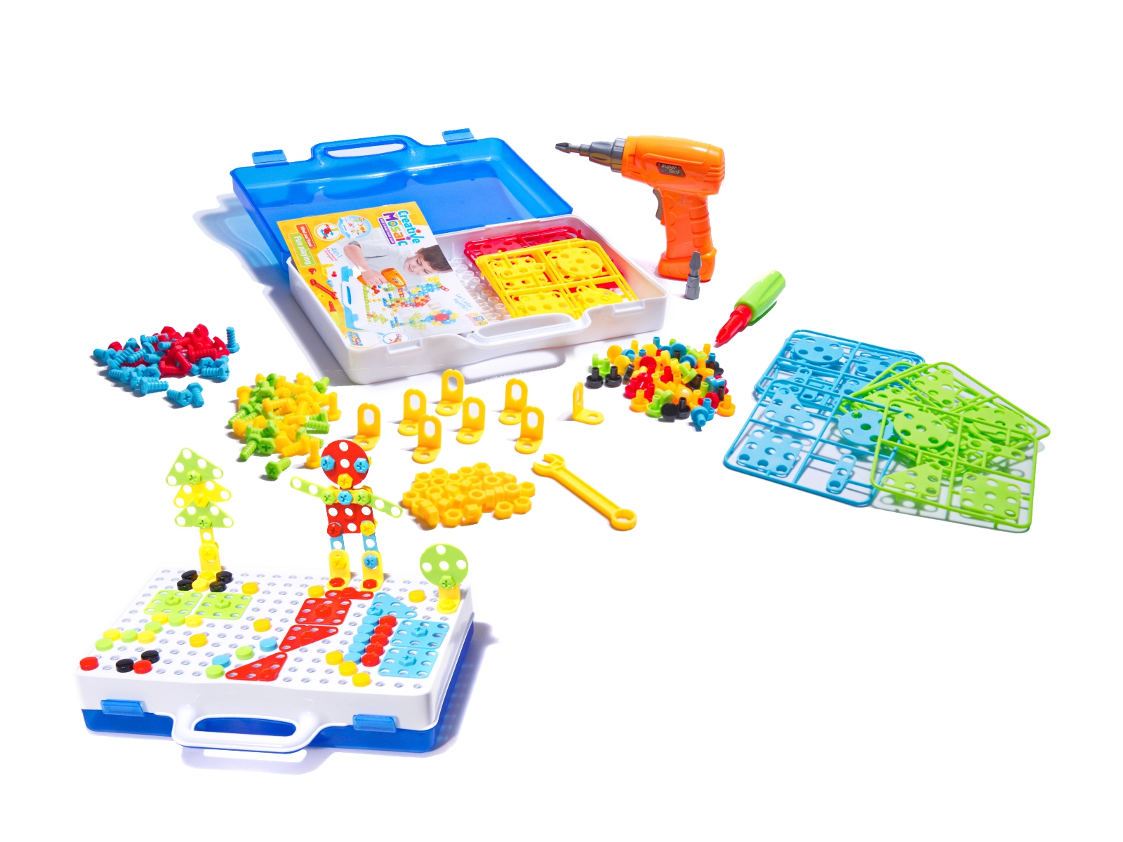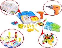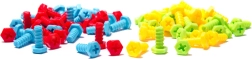 Комплектът включва пъстри винтове и елементи, които привличат вниманието на децата и помагат за развитието на фината моторика.