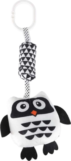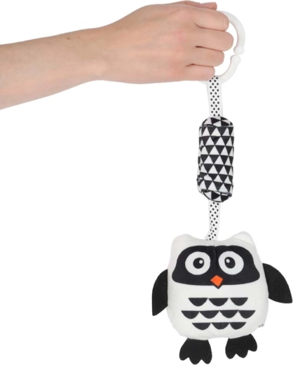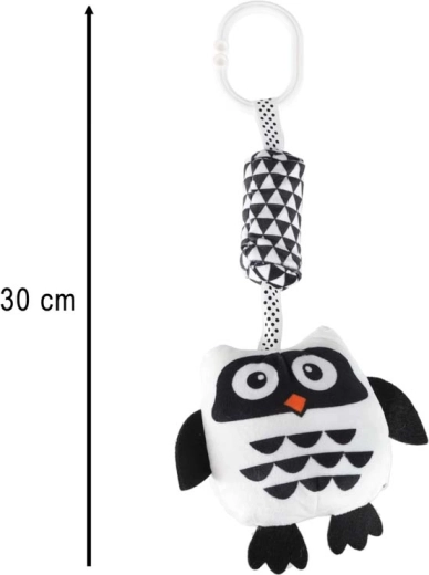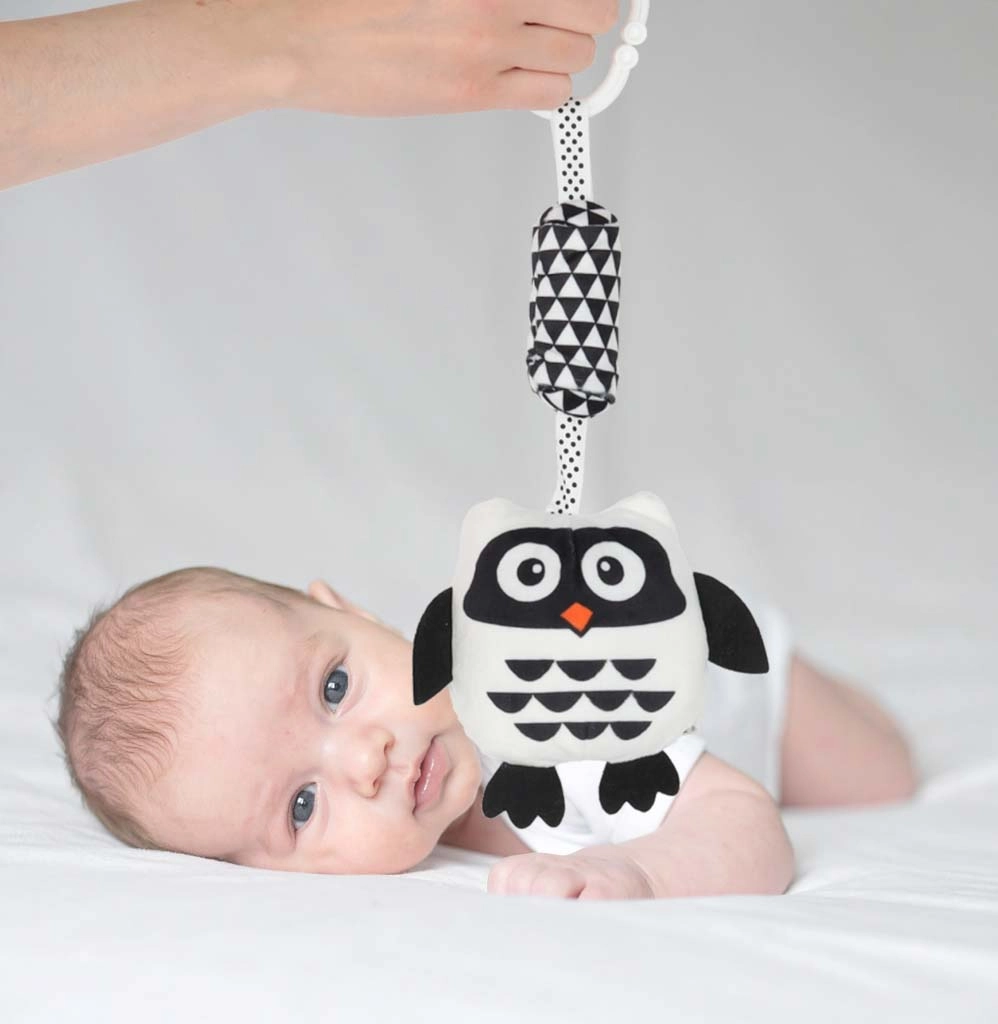 Тази контрастна висяща играчка във формата на бухал е проектирана с внимание към нуждите на новородените. Високият контраст между черно и бяло привлича детските очи и подкрепя ранното развитие на зрението. Меките, приятни на допир материали и безопасната изработка гарантират комфортно и сигурно откривателство.