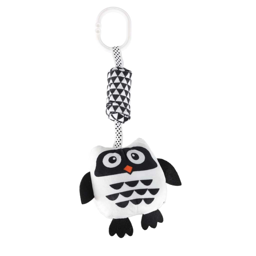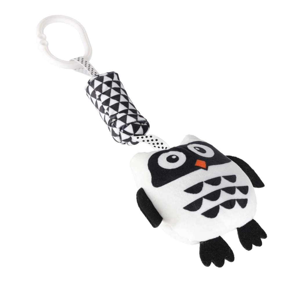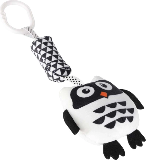 Сладък висящ бухал в черно‑бял дизайн за най-малките, който подпомага визуалната стимулация, развитието на сетивата и забавлението по време на път. Благодарение на практичната щипка лесно се закрепва към детска количка, столче за кола и кошара. Меки материали, различни текстури и дрънкащи/шушкащи елементи насърчават хващането и изследването.