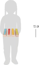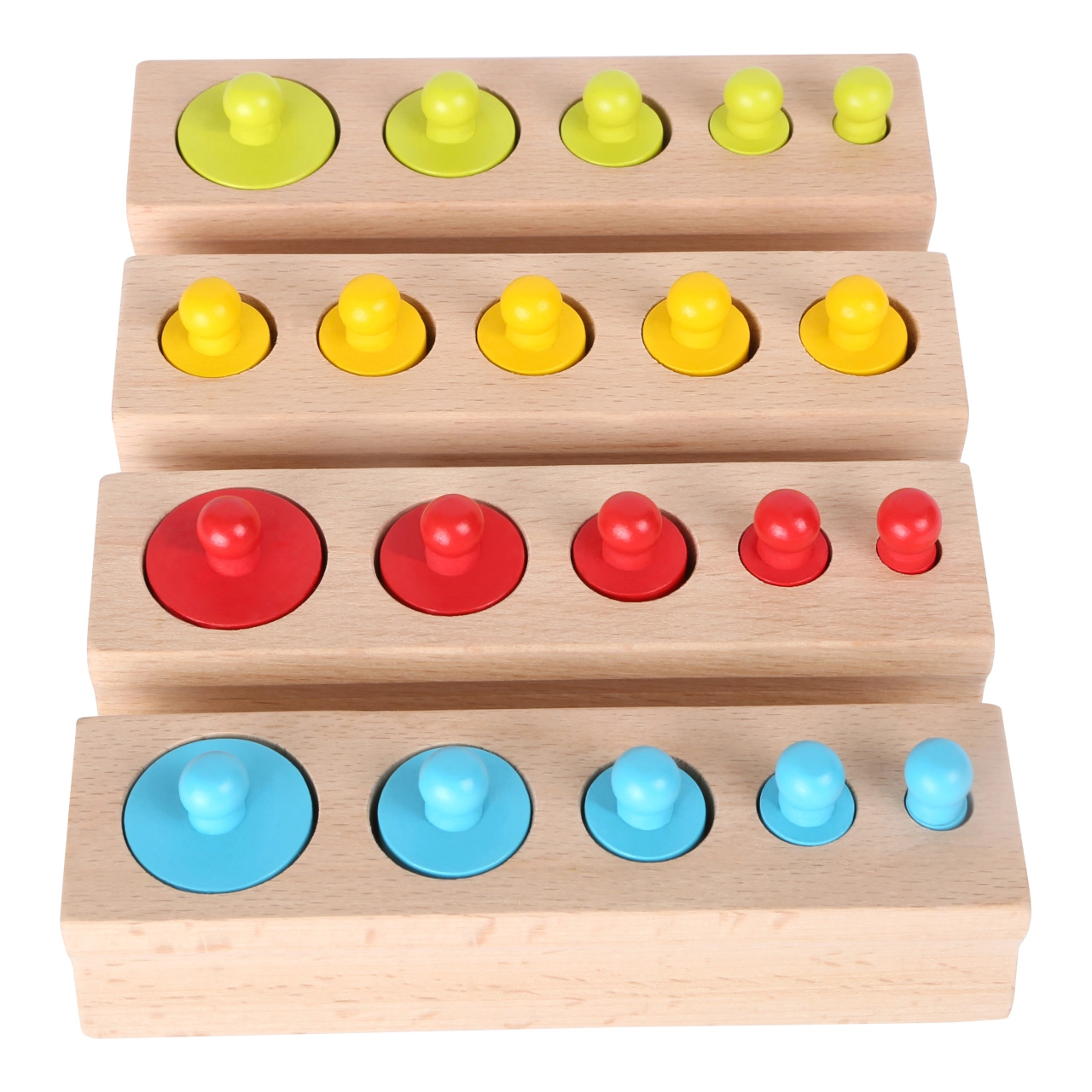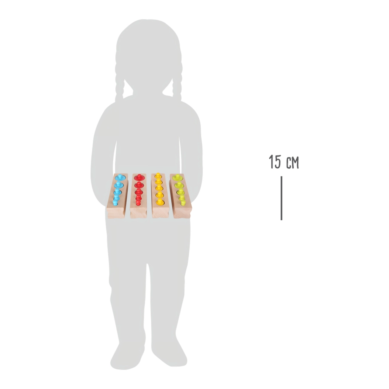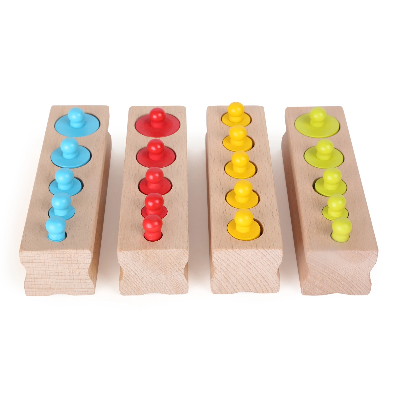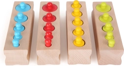 Дървените цветни цилиндри помагат на децата да разбират моделите и да вземат решения за правилното подреждане.