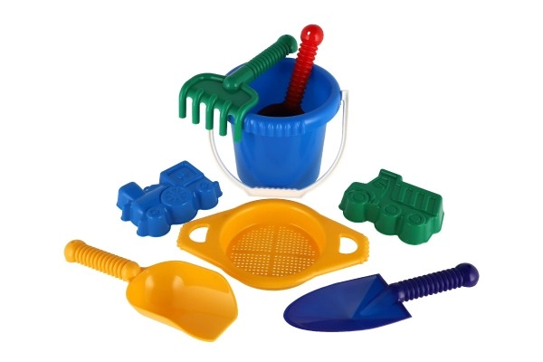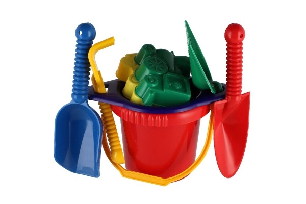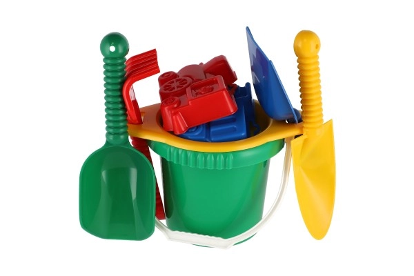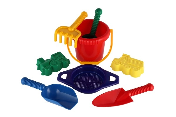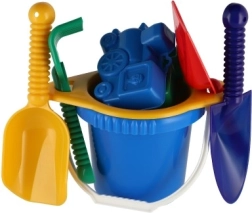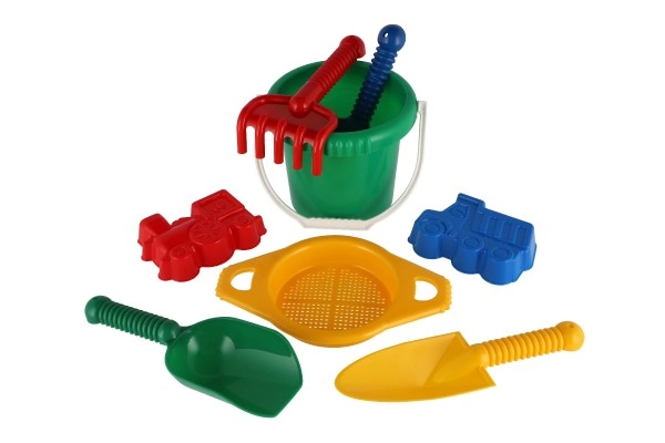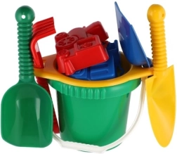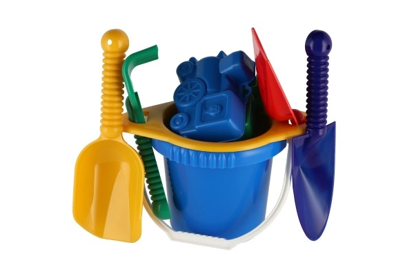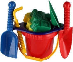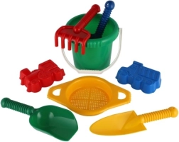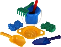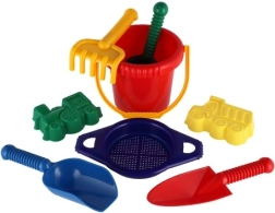 Съдържа всички необходими инструменти за строеж и креативна игра на пясъка – кофичка, сито, лопатки, греблички и две формички.