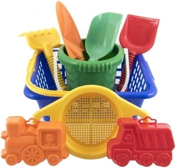 Този цветен комплект за пясък ще зарадва най-малките строители и любителите на плажа. Частите са леки, удобно се държат в малките детски ръчички и благодарение на практичната кошничка всичко е винаги заедно. Идеален за пясъчника, градината и морето.