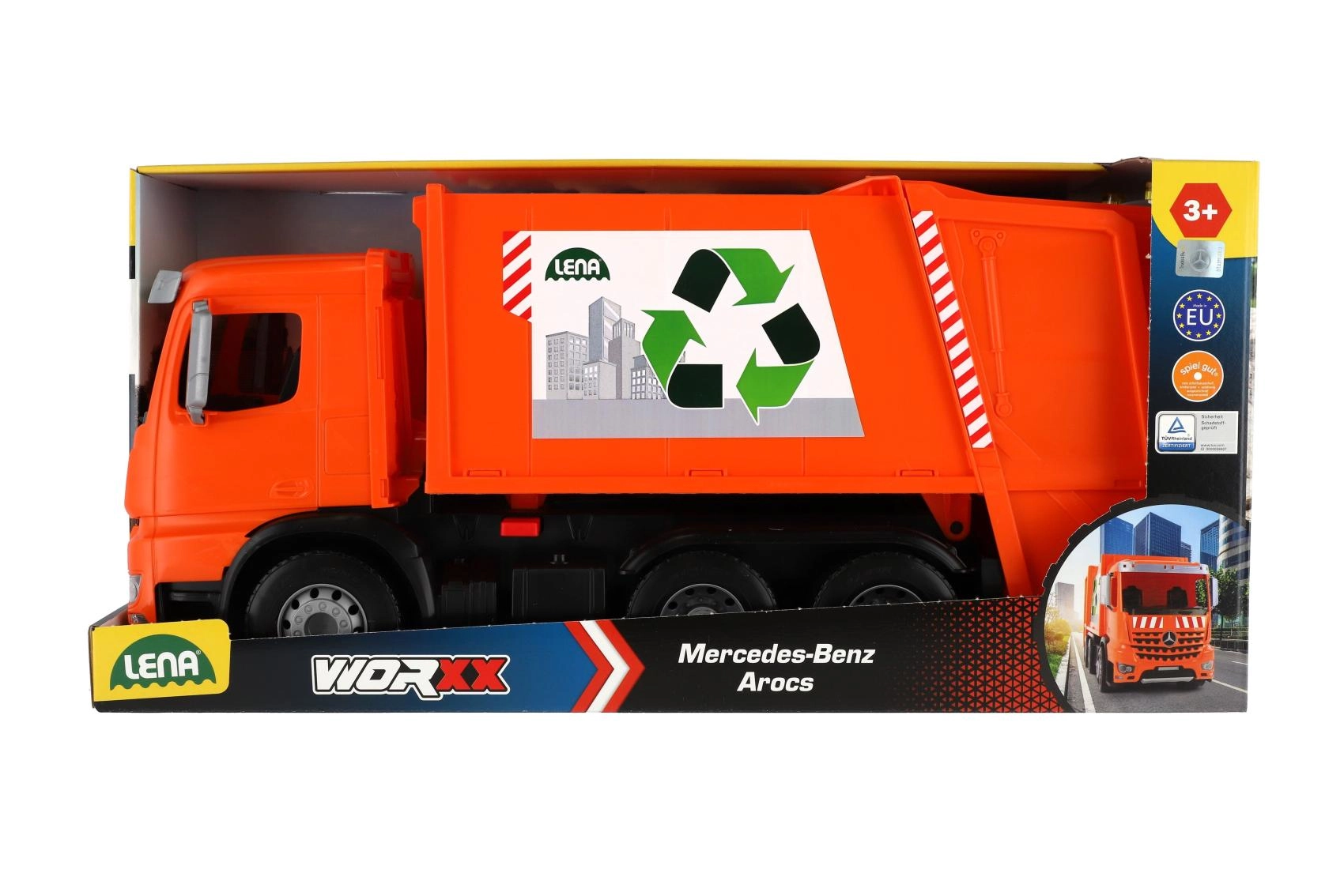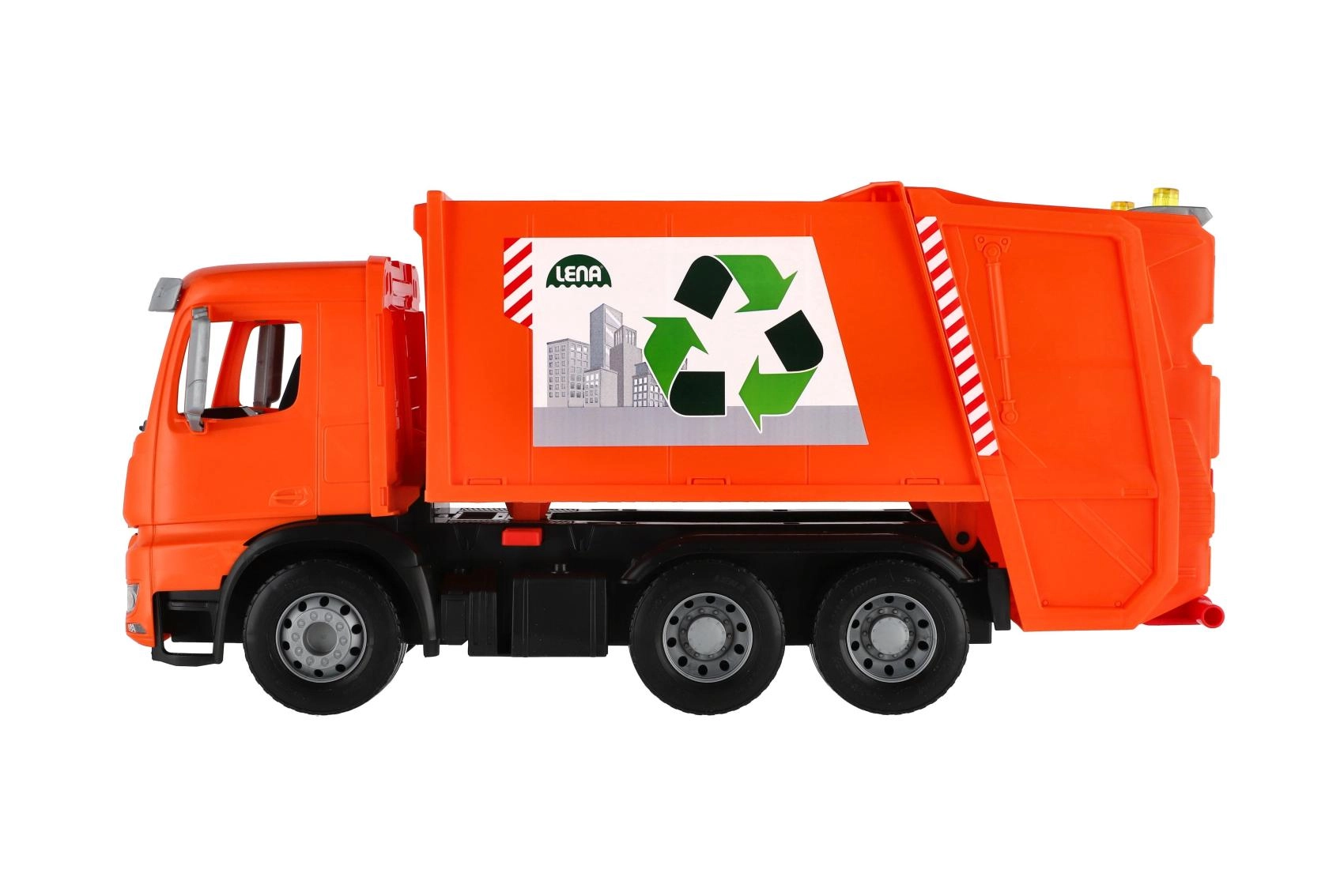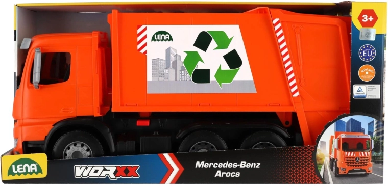 Оранжевият сметосъбиращ камион MERCEDES AROCS от марката LENA носи на децата реалистична игра по събиране на отпадъци. Предлага здрава пластмасова конструкция, здрави метални оси на колелата, предпазител срещу нежелано разтоварване и две кофи за още по-забавна игра. Страхотен за развитие на въображението, координацията и фината моторика у дома и в двора.
