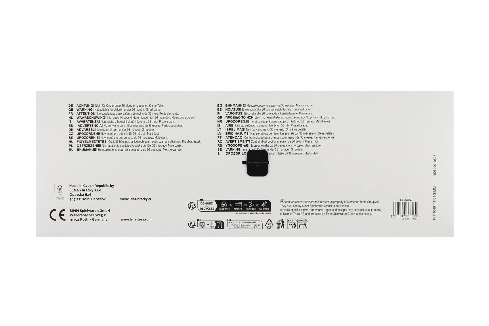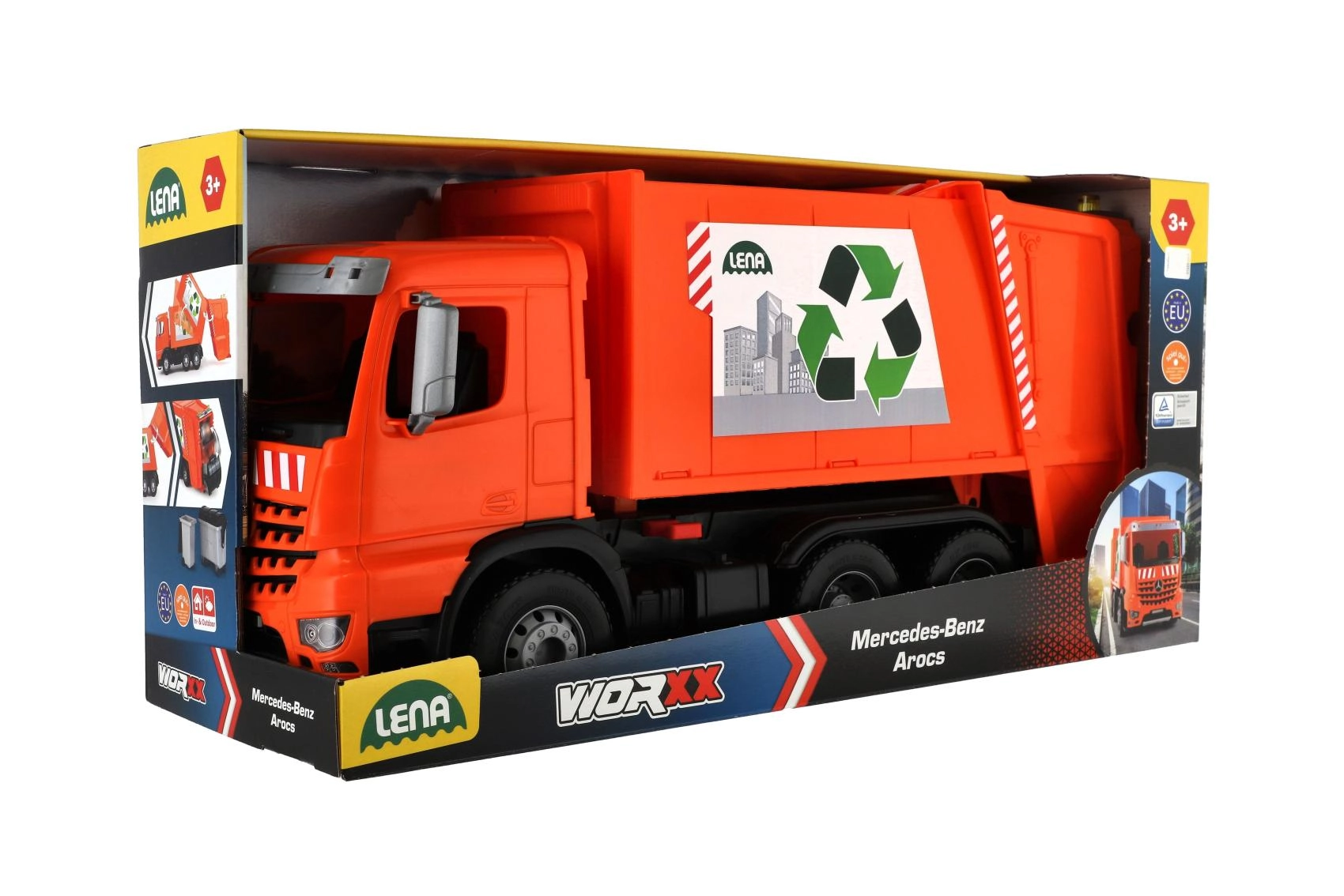 Сметосъбиращият камион MERCEDES AROCS от LENA е детайлно изработено превозно средство за малки любители на техниката. Благодарение на robustната изработка от качествена, устойчива пластмаса и здравите метални оси на колелата издържа на ежедневна игра вътре и навън. Функционалната задна част с предпазител позволява безопасно товарене и разтоварване на отпадъци.