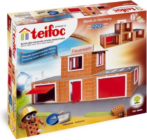 С конструктора TEIFOC пожарна станция децата преживяват реалистично строителство: разбъркват сместа, намазват тухлите и стъпка по стъпка изграждат собствена пожарна станция. Истинските мини тухлички и разтворимата във вода царевична смес осигуряват автентично изживяване и безопасно забавление.