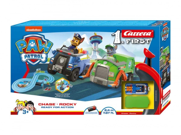 Пистата CARRERA FIRST с любимите герои от сериала Пес патрул е перфектен избор за деца от 3 години. Компактният комплект на батерии позволява състезание по всяко време и навсякъде – без нужда от електрически контакт. Благодарение на интуитивното управление и стабилната конструкция е идеална като първа писта.