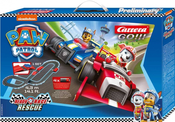 Забавната слотова писта CARRERA GO с тема Пес патрул предлага на деца от 5 години 4,3 m дълъг кръг с колички Чейс и Маршал. Комплектът включва скок, надлез, прави и завои и се захранва с батерии с възможност за закупуване на трафо. Съвместим с коли и части GO!!! за още повече забавление.