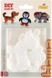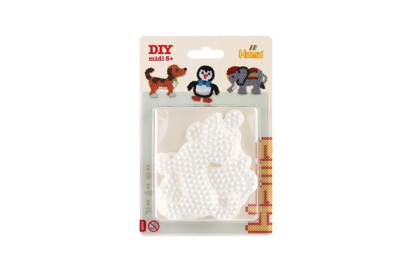 Комплектът подложки Hama за термо мъниста позволява на деца от 5 години да създават цветни изображения с помощта на бели пластмасови подложки във формата на слон, пингвин и кученце.
