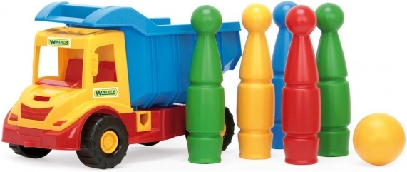 Самосвалът Multi Truck с подвижна товарна каросерия предлага забавление за нашите малки деца. В комплектa има сет за боулинг с 5 цветни кегли и топка.