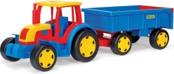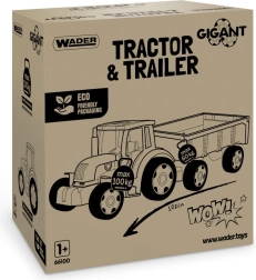 Нашият голям трактор от серията Gigant е оборудван с ремарке с отваряема задна клапа. Тези превозни средства са идеална играчка за деца, независимо дали става дума за строене, товарене или преместване на материали. Подвижната кофа на трактора служи като булдозер или товарач, което прави играта още по-забавна. Предимствата на този трактор са качествената изработка, издръжливостта и товароносимостта на конструкцията – тракторът издържа до 100 кг, а ремаркето до 60 кг.