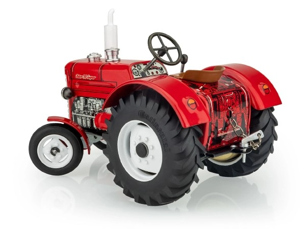 Класическият модел трактор Zetor 50 Super в мащаб 1:25 ще зарадва както колекционери, така и деца. Задвижването се осигурява от пружинен механизъм с ключ, налични са четиристепенна скоростна кутия, задна скорост, неутрал и ръчна спирачка. Предният мост е управляем с волан, а металната изработка придава на играчката истинска здравина.
