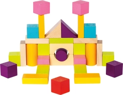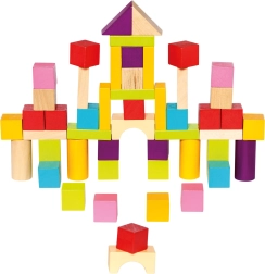 Благодарение на разнообразните форми – кубчета, цилиндри, дъги и триъгълници – децата строят кули, къщички и фантастични конструкции. Гладкото, качествено обработено дърво и пъстрите цветове подпомагат сетивното развитие и креативната игра.