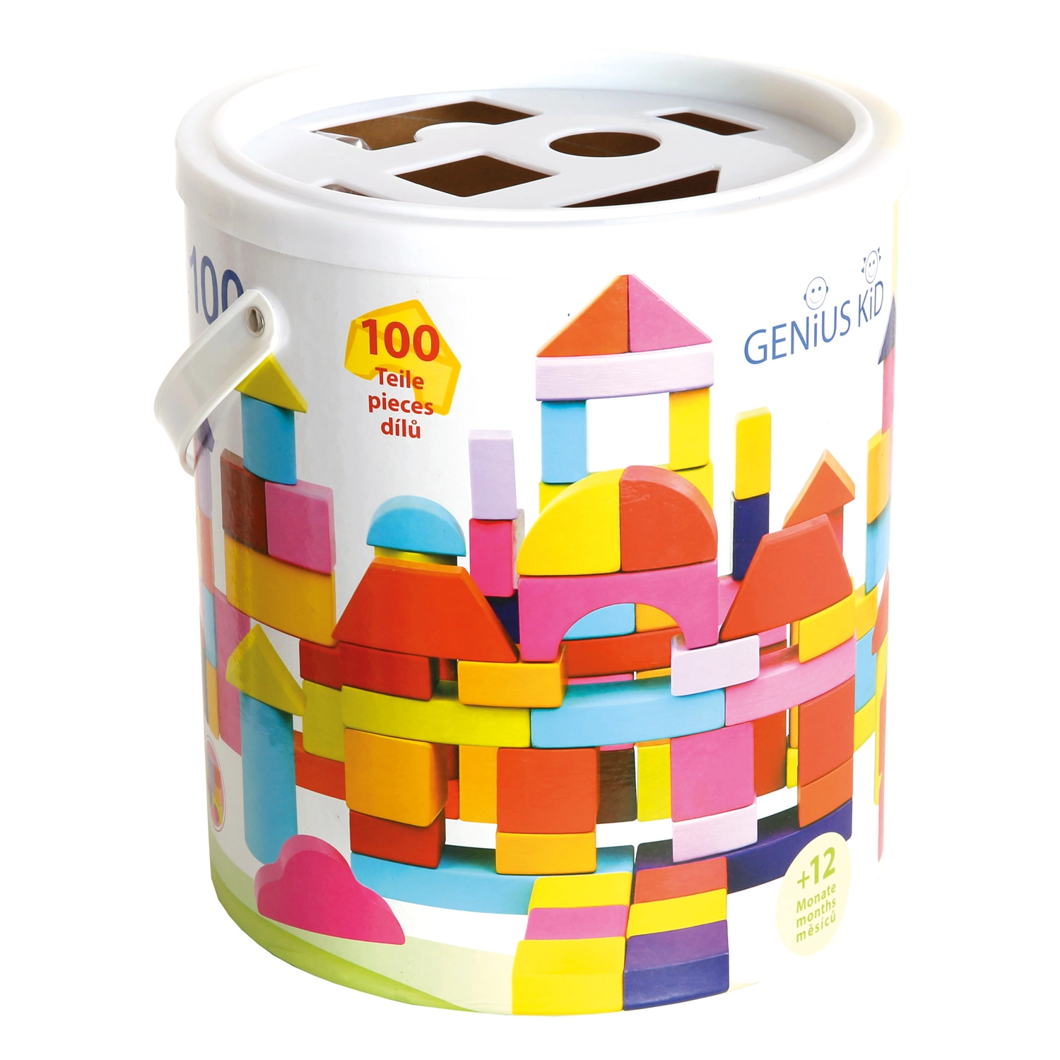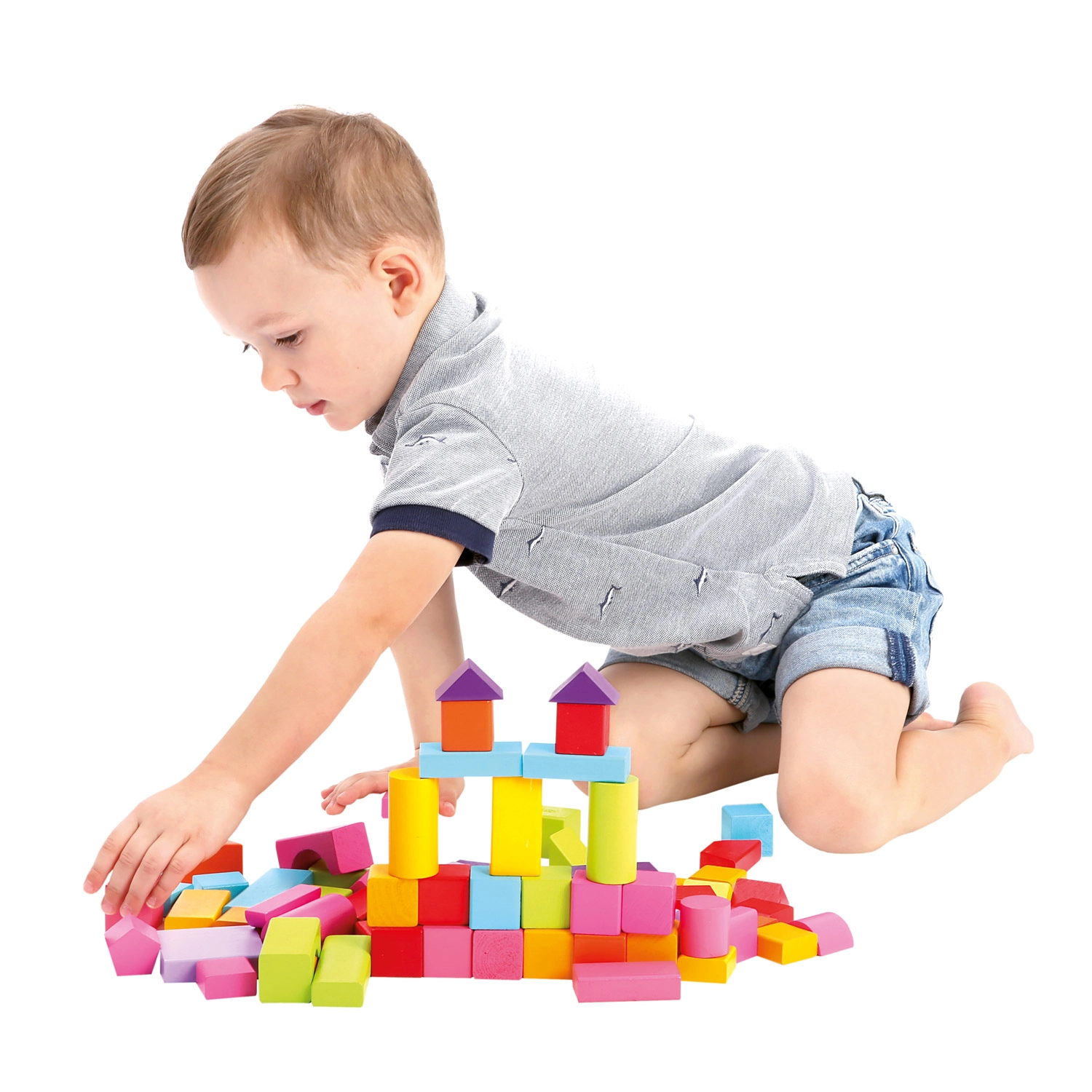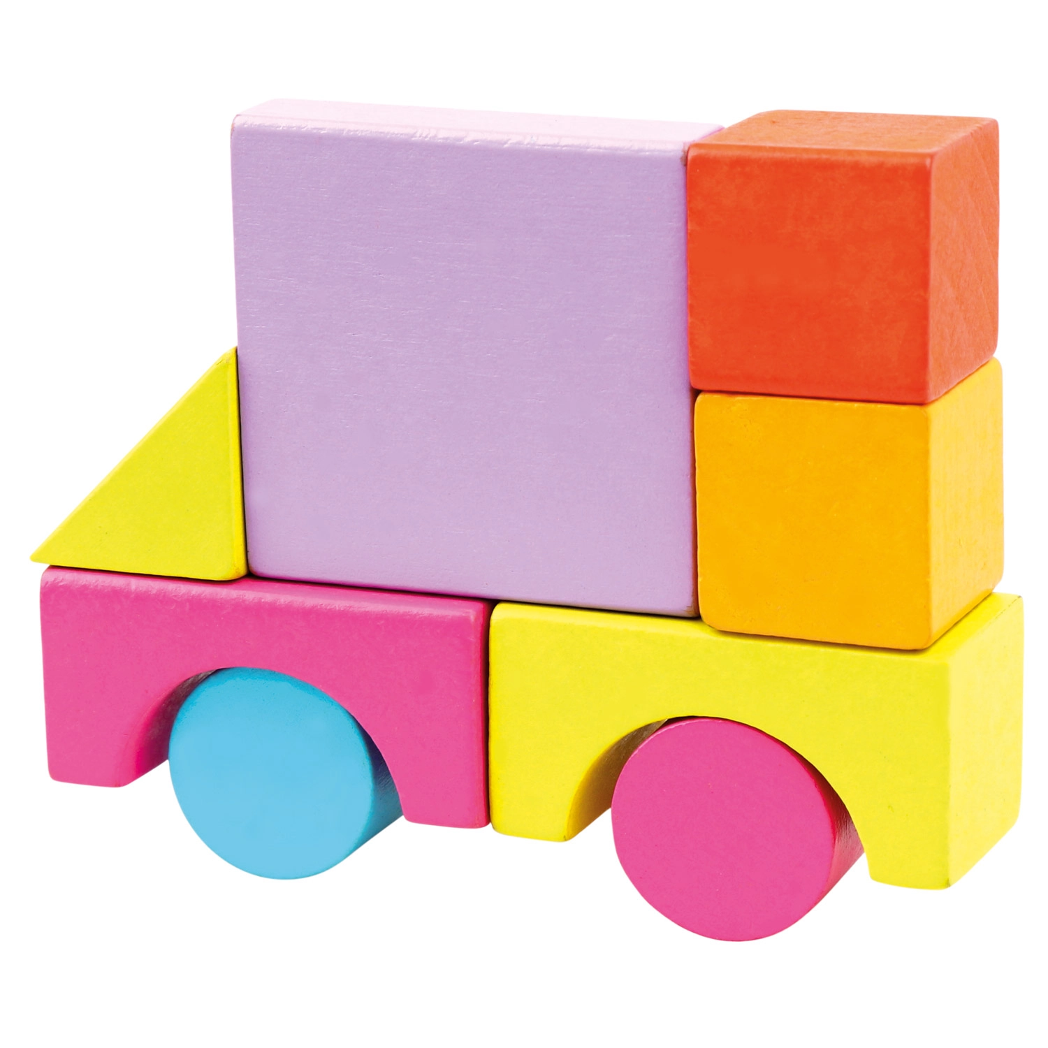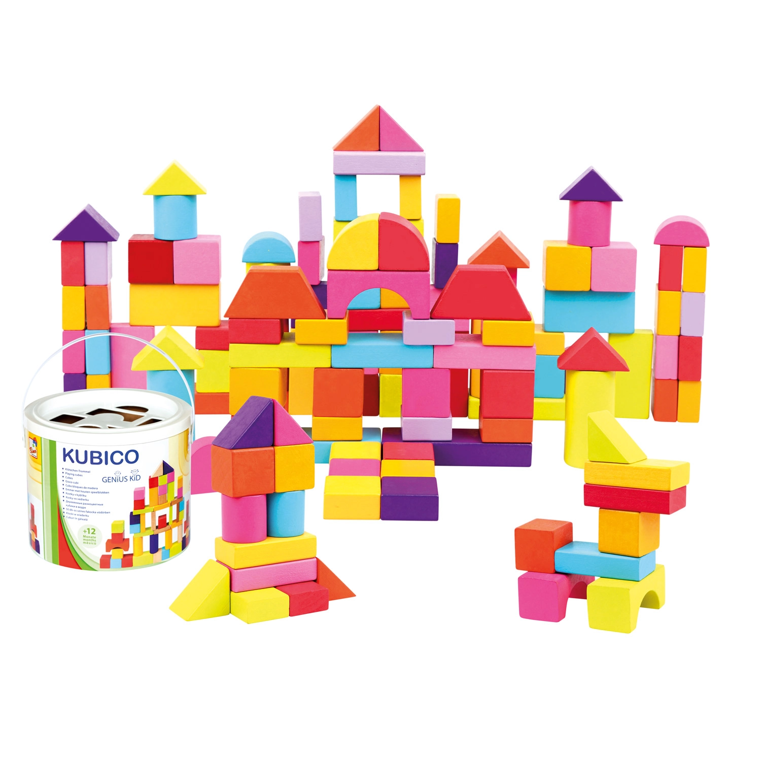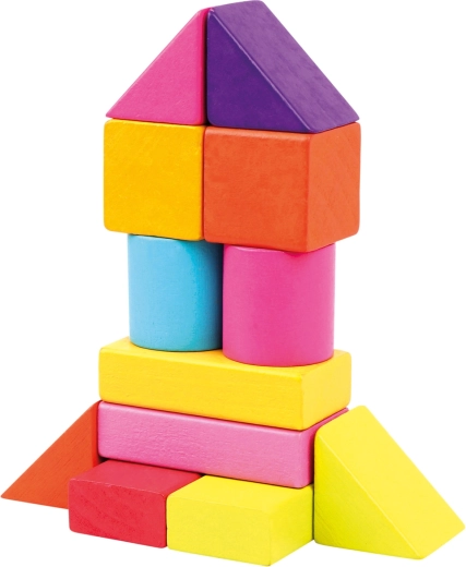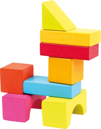 Идеален за деца от 1 година: блокчетата имат приятно гладка повърхност, пъстри безопасни бои и богато разнообразие от форми – от кубчета и паралелепипеди през цилиндри до дъги и триъгълници. Играта с блокчета подпомага развитието на пространственото възприятие, творчеството и координацията око–ръка.
