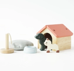 Разширете детския свят на въображението с очарователен комплект дървени домашни любимци – кученце и котенце с къщичка и аксесоари. Този качествен аксесоар за къщи за кукли и игрални сцени подпомага социалната игра, комуникацията и въображението. Изработен от FSC дърво, ръчно дооцветен с нетоксични бои на водна основа и проектиран да издържа дълго.
