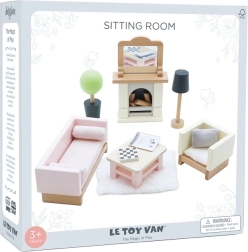 Комплектът съдържа 19 части: диван и кресло с текстилни възглавници, холна маса, камина с дърва и огледало, килим, цвете в саксия и лампа. Размерите са подходящи за къщи за кукли от Le Toy Van. Допълнителни аксесоари за къщи от серията Daisylane са налични на нашия уебсайт.