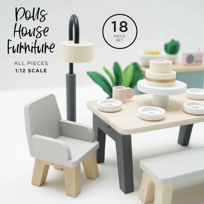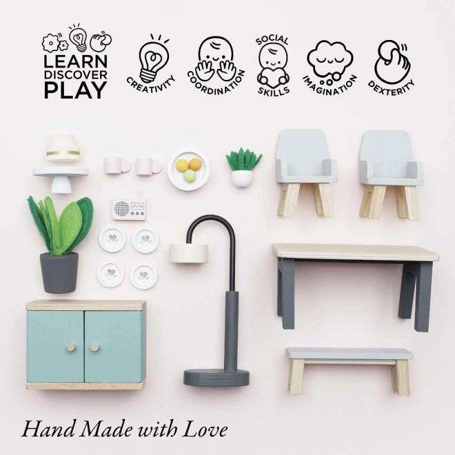 Този очарователен трапезен комплект е изработен от висококачествена дървесина с FSC сертификация и носи щрих на изисканост във всяка къща за кукли. Съдържа 18 елемента, включително маса, две кресла, пейка, лампа, шкаф за прибори и декоративни допълнения като растения, купа с плодове и торта. Комплектът не само изглежда красиво, но и подпомага когнитивните и комуникационните умения на децата. Той е декориран с нетоксични бои на водна основа и е съвместим с други къщи за кукли Le Toy Van.
