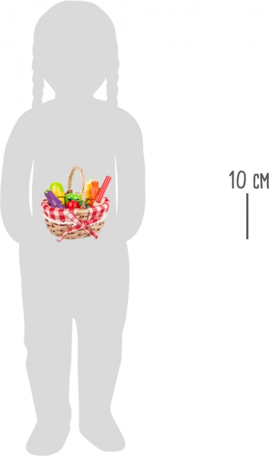 Този качествен комплект включва плетена кошница с карирана подплата и дървени парчета плодове и зеленчуци (ягоди, морков, патладжан, царевичен кочан, ябълка, банан и др.). Елементите са свързани с велкро, така че децата могат безопасно да „режат“ с дървения нож и да ги съединяват отново. Перфектно допълнение към детската кухничка и пазарния щанд.