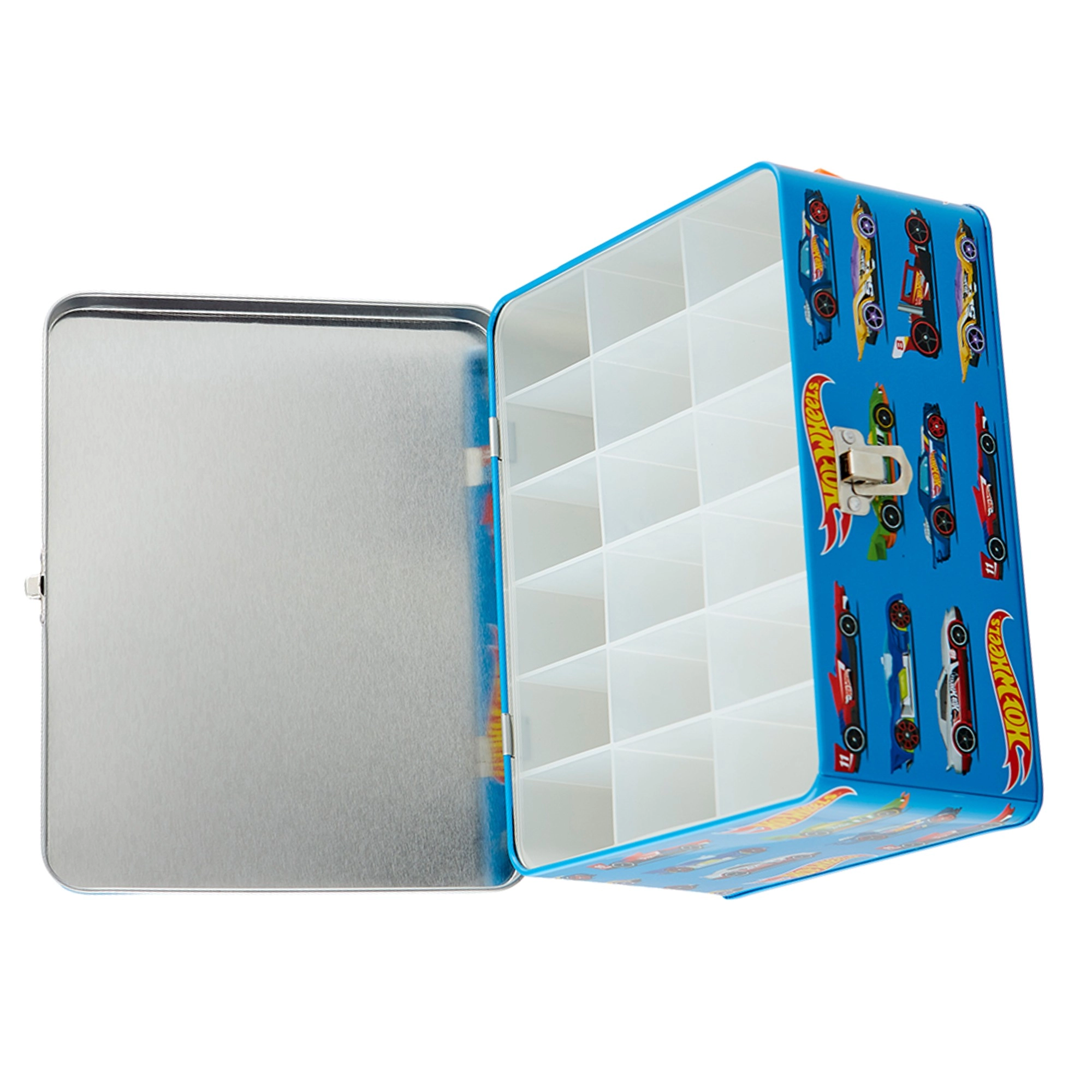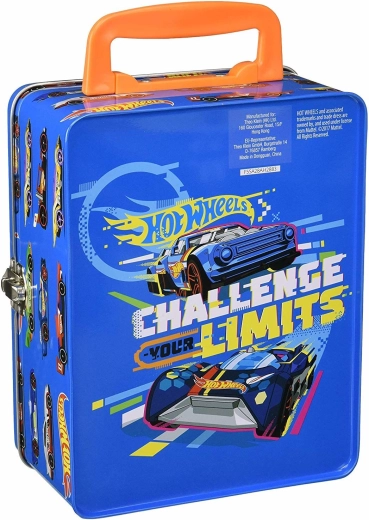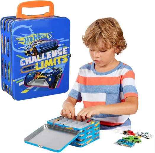 Този стилен син куфар с графики на състезателни автомобили и слогана „Challenge Your Limits“ е страхотно решение за всички малки колекционери. Вътре ще откриете изваждаща се решетка с 18 отделни отделения, които поддържат количките подредени и защитени. Здравата метална конструкция и надеждното катарамово закопчаване осигуряват безопасно съхранение при пренасяне.
