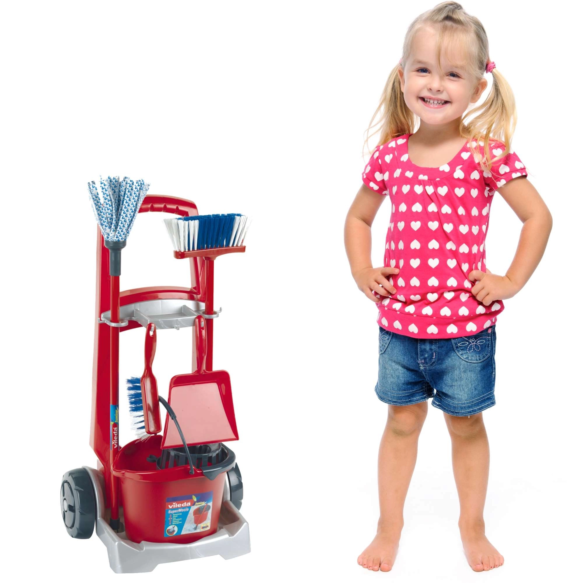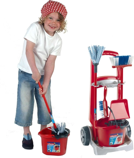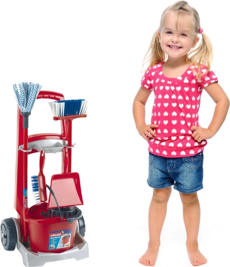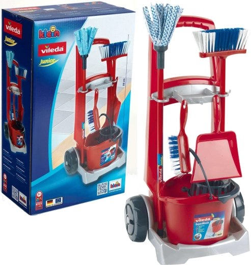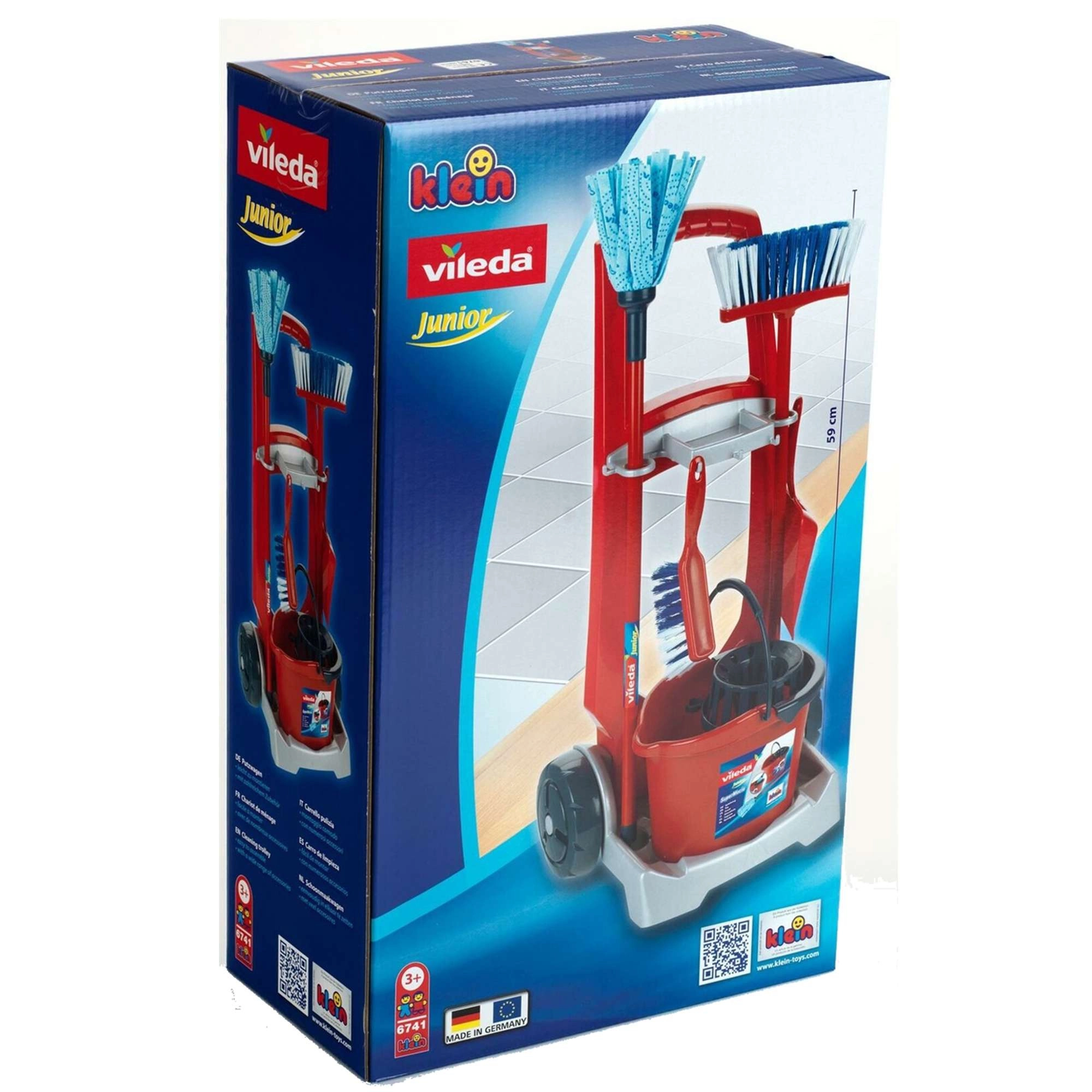 Детската почистваща количка Vileda от марката Klein е богато оборудван комплект за реалистична игра на домакинство. Включва количка на колелца, кофа с изстискващ кош, моп, метла, ръчна четка и лопатка. Подпомага ролева игра, учи децата на ред и отговорност и благодарение на здравата изработка гарантира дълъг живот.