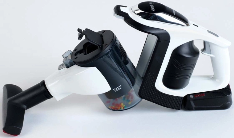 Част от комплекта са отворяем контейнер за „замърсявания“ за лесно изсипване, широка подова четка с въртящ се валяк и тесен накрайник за детайлно почистване. Пръчката може лесно да се свали и прахосмукачката да се използва като компактна ръчна единица – идеална за трохи и бързо почистване по време на игра.