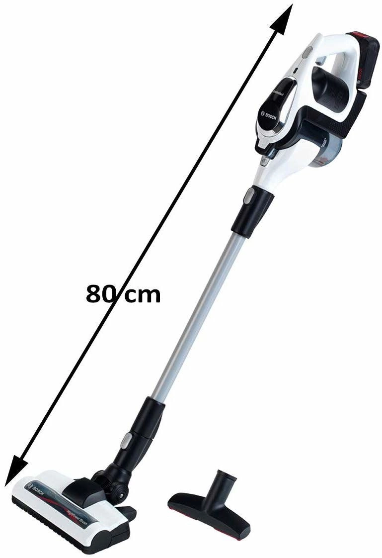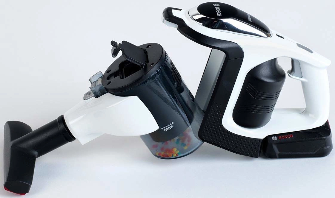 Автентичната детска прахосмукачка BOSCH Unlimited в бяло‑черно изпълнение със сребърна тръба достоверно наподобява истински уред. Благодарение на LED осветлението и въртящите се топчета в прозрачния контейнер изглежда много реалистично при „прахосмукиране“, като остава напълно безопасна за игра.