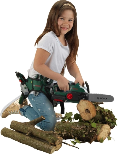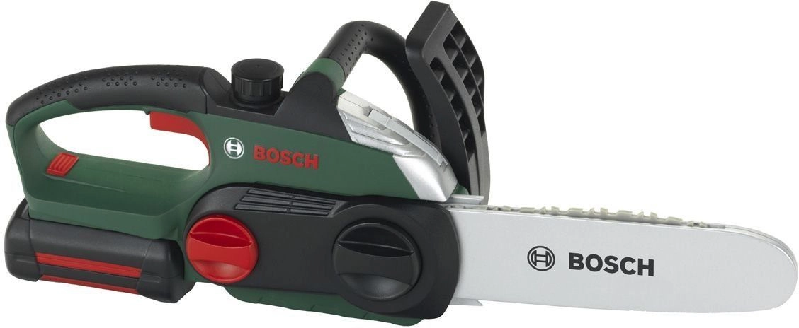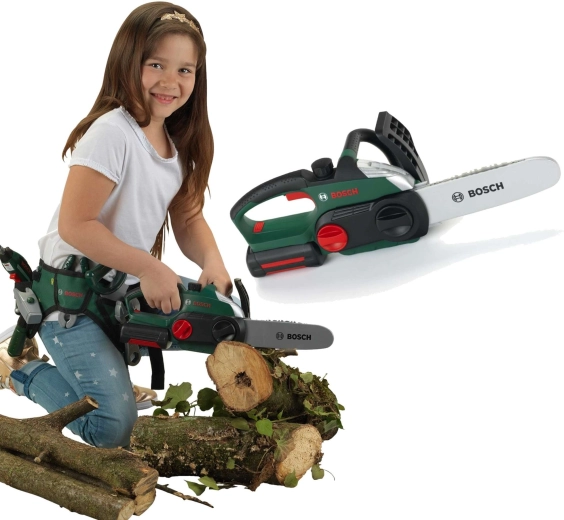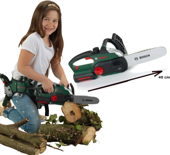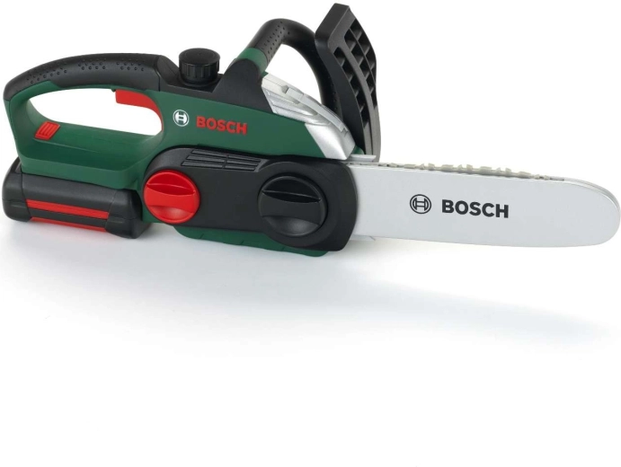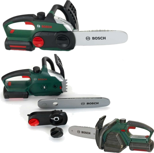 Тази детска безжична верижна резачка достоверно наподобява истинския инструмент BOSCH – включително тъмнозеленото изпълнение с червени и сребърни елементи. Изработена е здраво и с внимание към детайла, за да се радват децата на автентична игра на дървар или градинар в пълна безопасност.