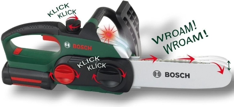 Дизайнът вярно копира оригиналната резачка BOSCH в емблематичния зелен цвят със сребърна шина и червени елементи – идеален за истинска игра „като професионалист“.