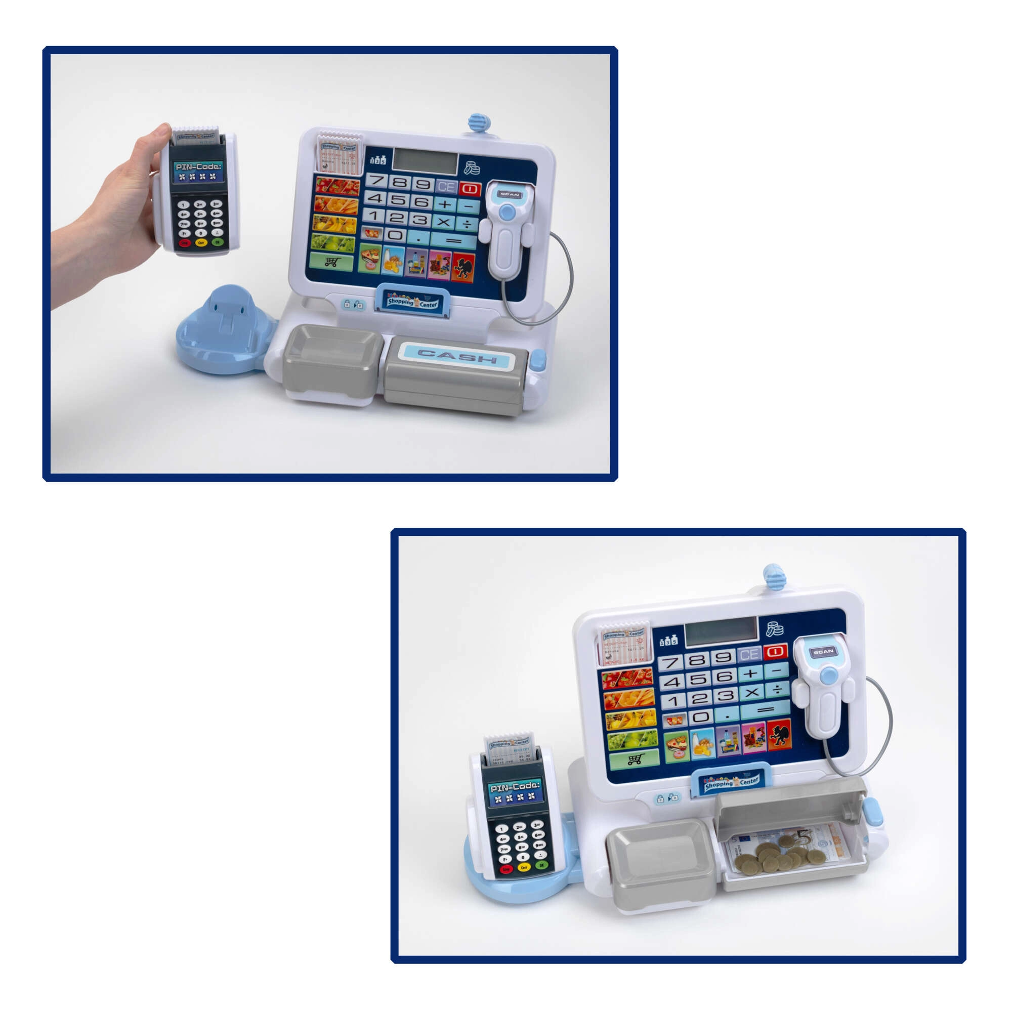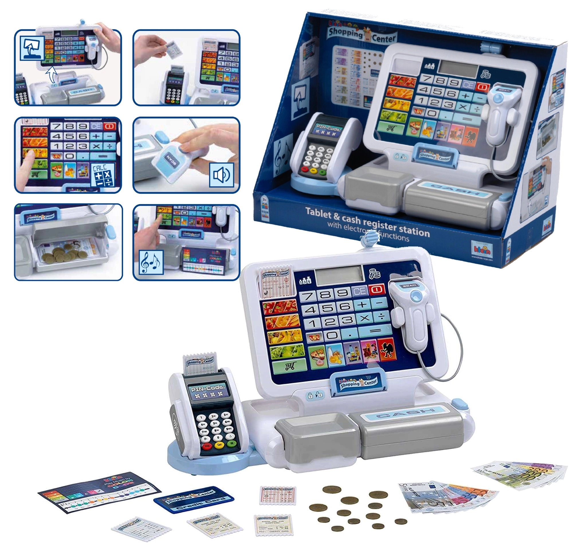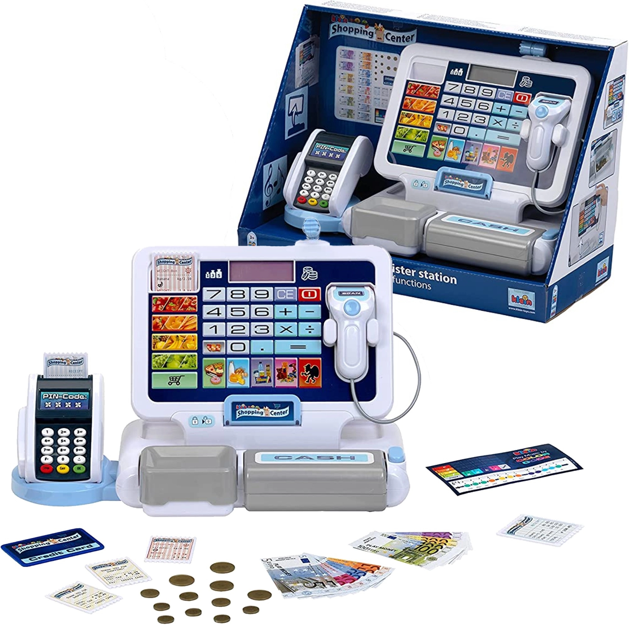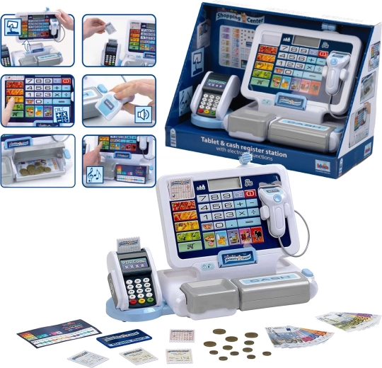 Реалистична детска каса с терминал и скенер от марката KLEIN носи автентична игра на магазин. Предлага функционален дисплей с калкулатор, отваряем чекмеджe за пари, четец на карти, звукови ефекти и богато принадлежност включително евромонети и банкноти, касови бележки и „кредитна“ карта – идеално за развиване на сметни умения, финансова грамотност и ролева игра.