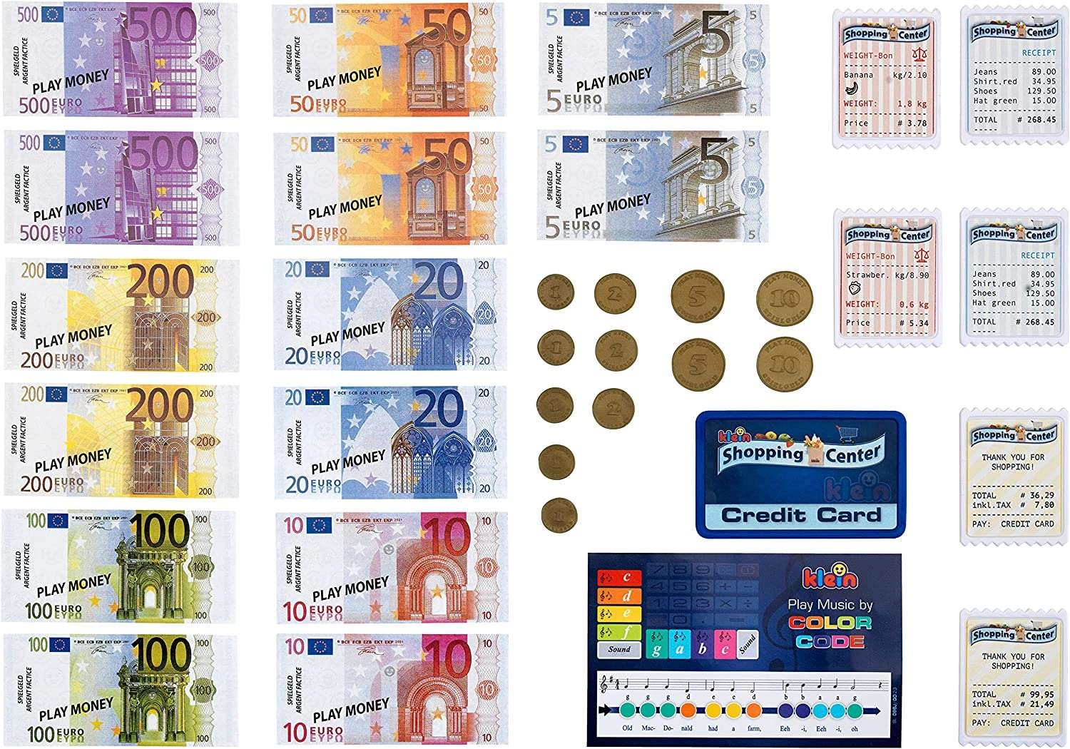 евромонети, банкноти (5–500 €), касови бележки, платежна карта, картонче с песнички